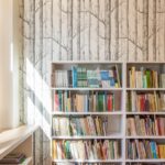 Medžiais dekoruotų tapetų, kurių raštas atkartoja vaizdą už lango, sienoje įrengta skaitymo vieta primena uoksą arba slėptuvę medyje.