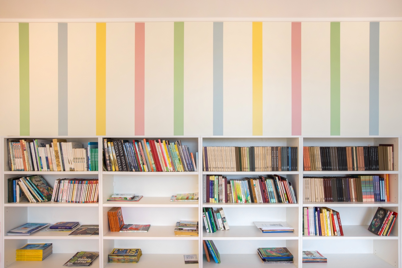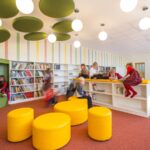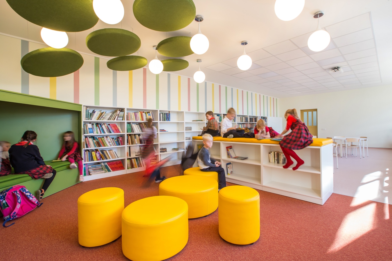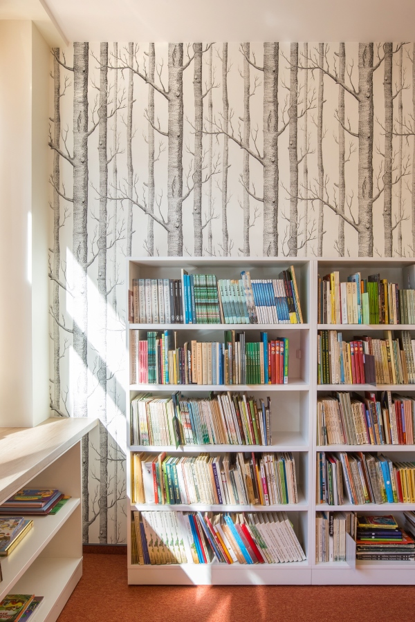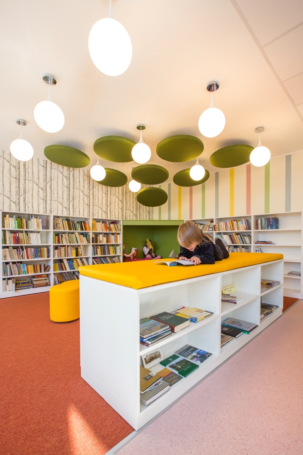 Grįžusi prie darbo architektė davė laisvę fantazijai. Taip niūri, užsukti netraukusi patalpa tapo tylia, šviesia ir spalvinga erdve su jaukiomis skaitymo vietomis bei vaikų fantaziją lavinančiais elementais.