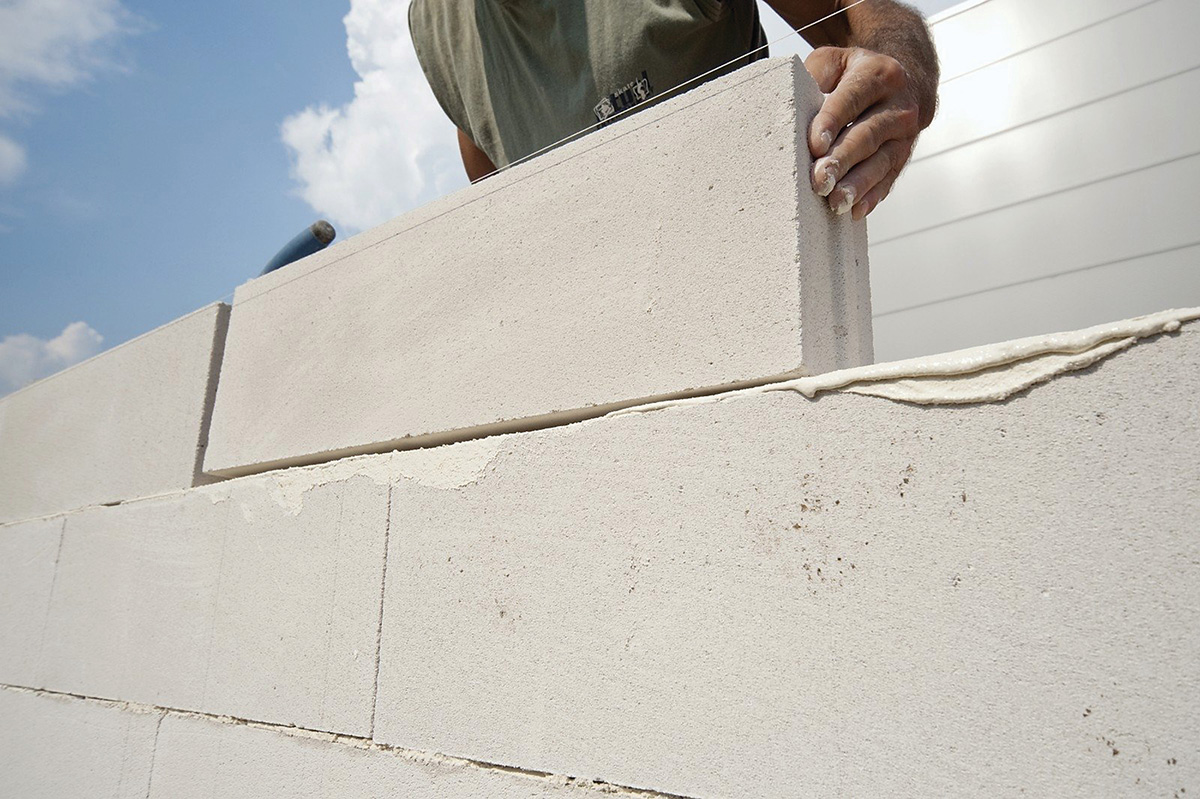 Dažniausiai sienos mūrijamos iš akytojo betono (dujų silikato), keraminių, keramzitbetonio ar silikato blokelių.