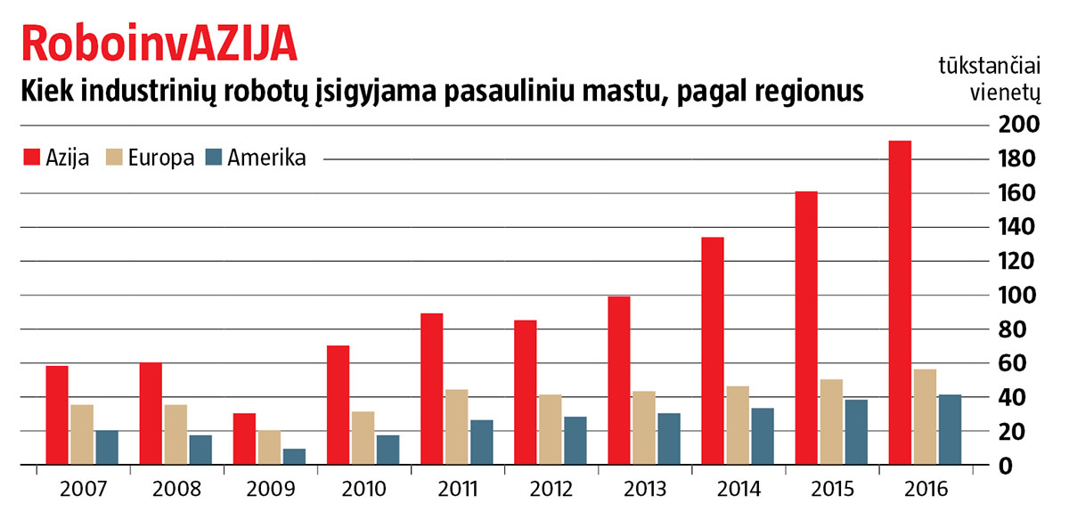Pramoninių robotų daugiausia nuperka Azijos šalys ir šiuo aspektu jos gana smarkiai lenkia kitus regionus (žr. grafiką). A. Jasėnas mano, kad konkuruoti vien robotizuota gamyba vargu ar sugebėsime, todėl reikėtų galvoti apie platesnę skaitmeninių inovacijų strategiją.