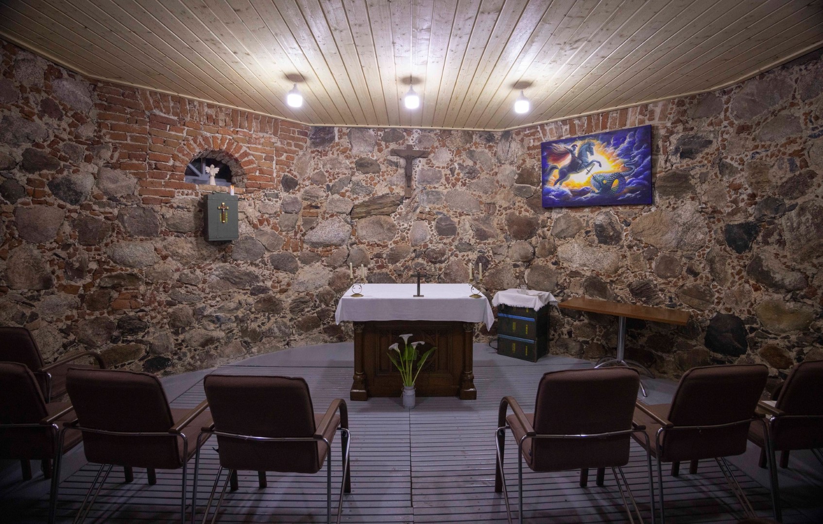O koplyčios tabernakulis – vieta, kurioje laikomas Švenčiausiasis Sakramentas – Dievo kūnas, pagamintas iš šovinių dėžės.
