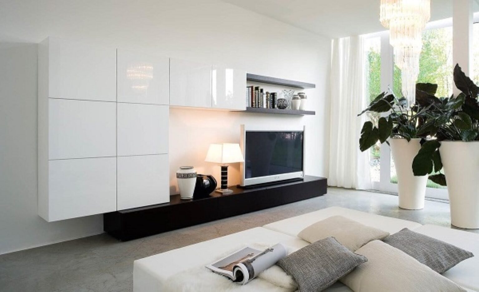 Balta spalva, būdinga tamsiai svetainei, yra gerai žinoma dėl savo apšvietimo savybių. Pasirinkę baldus su itin blizgia apdaila, sustiprinsime taip trokštamą padidinimo efektą. Blizgūs baldai interjere elgiasi kaip veidrodis. Atspindėdami šviesą, jie skleidžia ją po kambarį. Ši smulkmena daro teigiamą įtaką interjero išvaizdai, be to, šiandien yra vienas madingiausių motyvų.