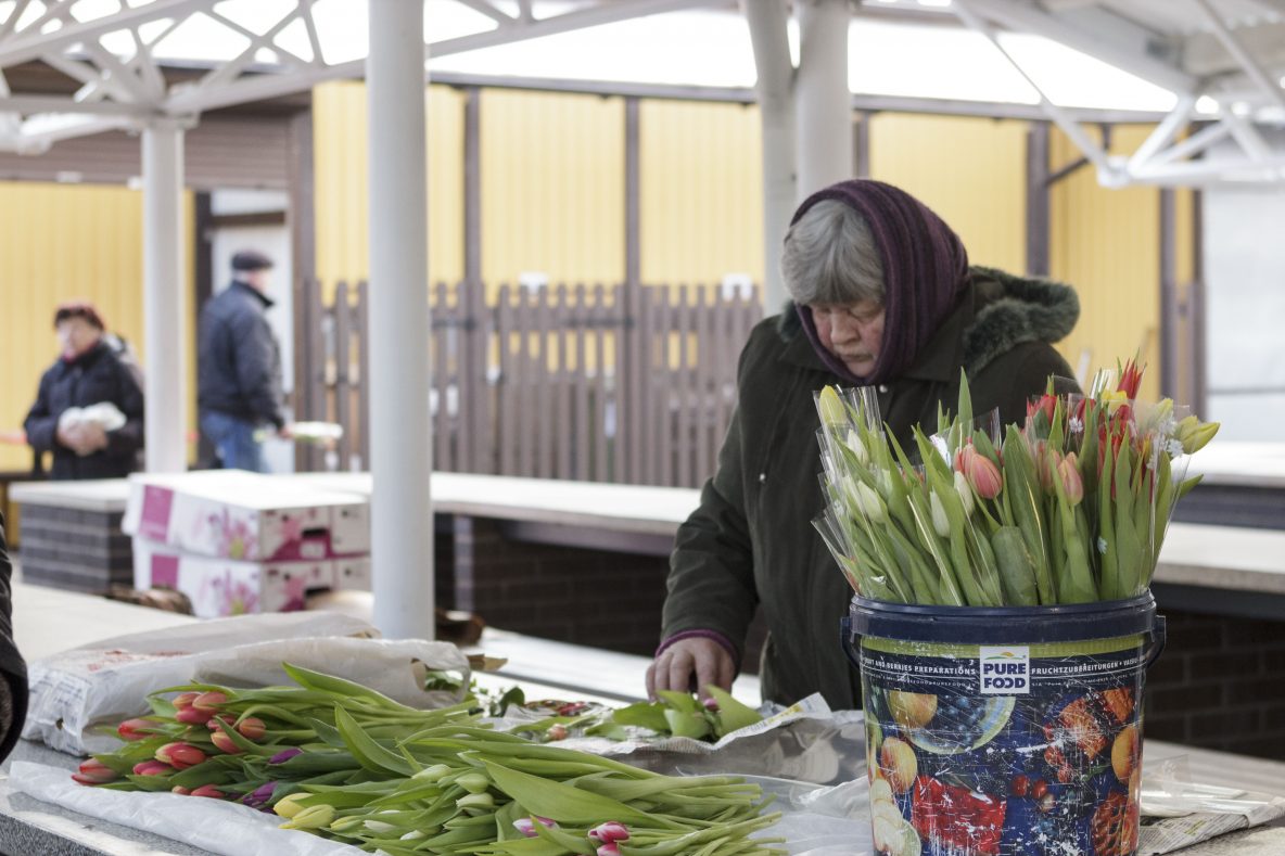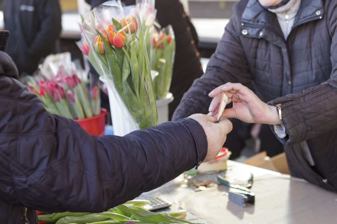 Mylimoms šeimos moterims Bronius svarstė nupirkti dvi puokštes po septynias tulpes. Jų kainos šiandien turguje siekė nuo 50 iki 80 ct.