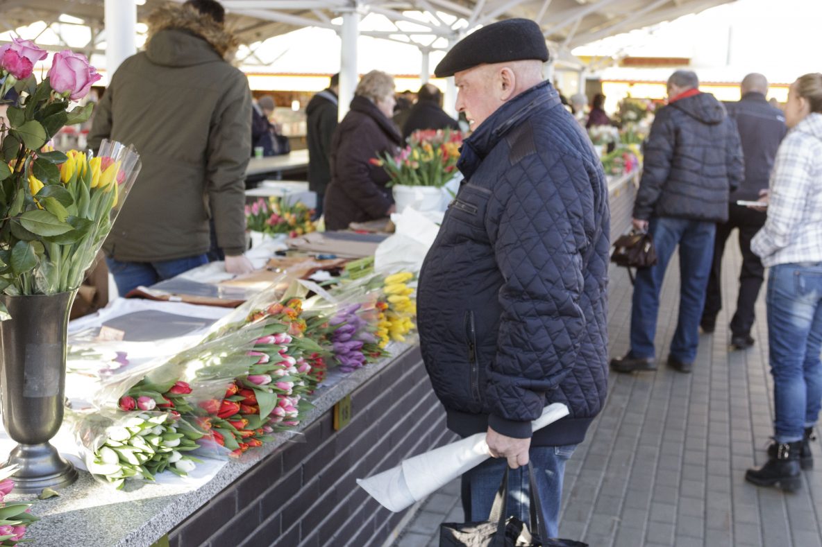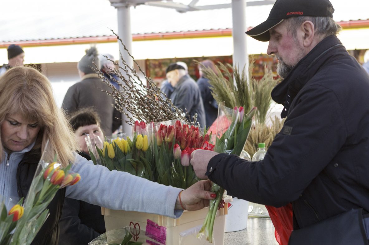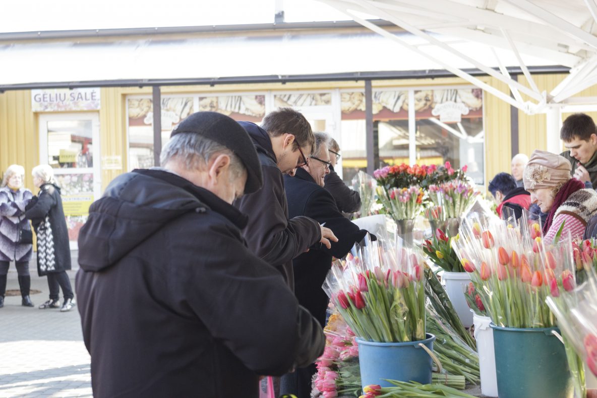 Net artėjant vidudieniui turguje prie gėlių prekystalių vis dar netrūko vyrų, kurie trypčiojo nepasispręsdami, kaip geriau pasveikinti savo moteris.