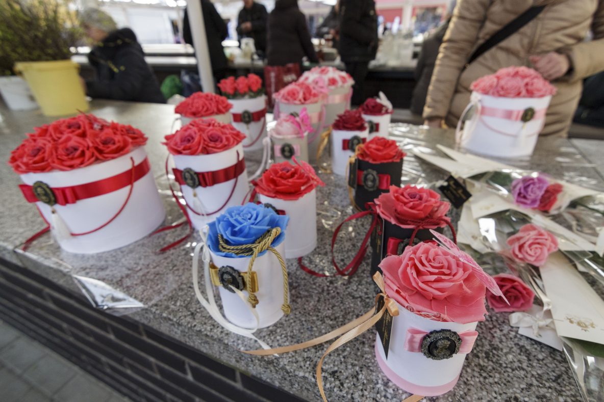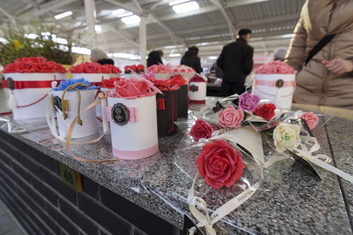 Šiek tiek mažesnės eilės driekėsi buvo prie dirbtinių žiedų. Juos po daugiau nei 4 eurus iš popieriaus išlankstytus tą dieną siūlė bitininkas Vitalijus, mėgstantis laisvalaikiu užsiimti rankdarbiais. Iš specialios masės lipdytas puokštes siūlė Dovilė. Jų viena kainavo nuo 5 iki 20 eurų.