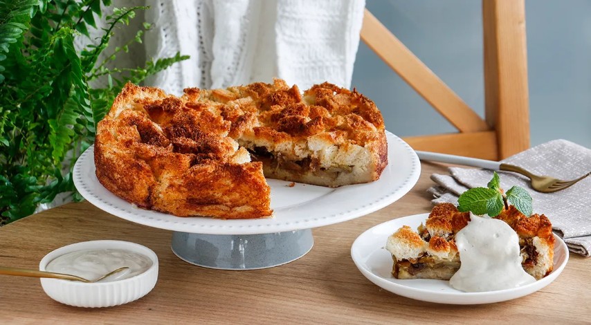 Reikės (6 porcijoms): 160 ml vandens, 6 šaukštų medaus, 100 g razinų be kauliukų, 1 citrinos žievelės ir sulčių, 40 ml tamsaus romo, 4 didelių kietų kriaušių, 50 g sviesto, 2 šaukštų rudojo cukraus, 0,5 šaukštelio malto cinamono, 600 g baltos duonos; kremui: 500 ml grietinėlės, 8 pakelių ramunėlių arbatos (galima pakeisti į mėtų), 8 kiaušinių trynių, 80 g cukraus.
