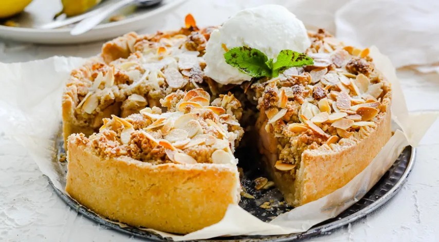Reikės (6 porcijoms): 500 g trapios tešlos, 5 didelių kriaušių (geriausia ′Conference′), 1 šaukšto citrinos sulčių, 50 g rudojo cukraus, cinamono, 30 g migdolų lapelių (papuošti), plombyro – patiekti, muskatų; papuošti: 140 g avižinių dribsnių, 50 g miltų, 80 g migdolų, 100 g miltelinio cukraus, 140 g atšaldyto sviesto, 3 šaukštų skysto medaus, druskos.