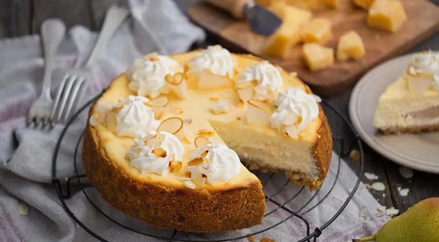 Reikės (8 porcijoms): pagrindui: 150 g trapių sausainių, 100 g skrudintų migdolų, 120 g sviesto; įdarui: 500 g kreminio sūrio, 200 ml pieno, 130 g kietojo brandinto sūrio, 100 g cukraus, 3 kiaušinių trynių, 2 prinokusių, bet kietų kriaušių, 150 ml baltojo vyno, 2 šaukštų medaus; papuošti: 100 ml riebios grietinėlės, 50 g kreminio sūrio, 2 šaukštų miltelinio cukraus, 1 kriaušės.