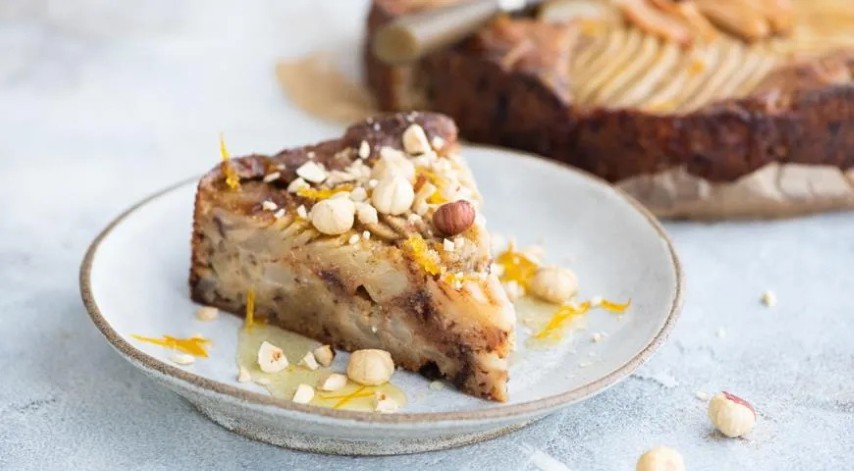Trapios tešlos pyragas su kriaušėmis ir lazdynų riešutais