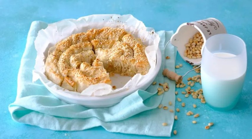 Reikės (6 porcijoms): 6 filo tešlos lakštų, 400 g minkštos varškės, 2 didelių kriaušių, 2 kiaušinių, 100 g saldžių vanilinių džiūvėsių, 50 g kedrinių pinijų, 1 šaukšto sezamų, 3 šaukštų alyvuogių aliejaus, 4 šaukštų cukraus, cinamono – ant peilio galiuko; tešlai aptepti: 1 kiaušinio trynio, 1 šaukšto pieno arba vandens.
