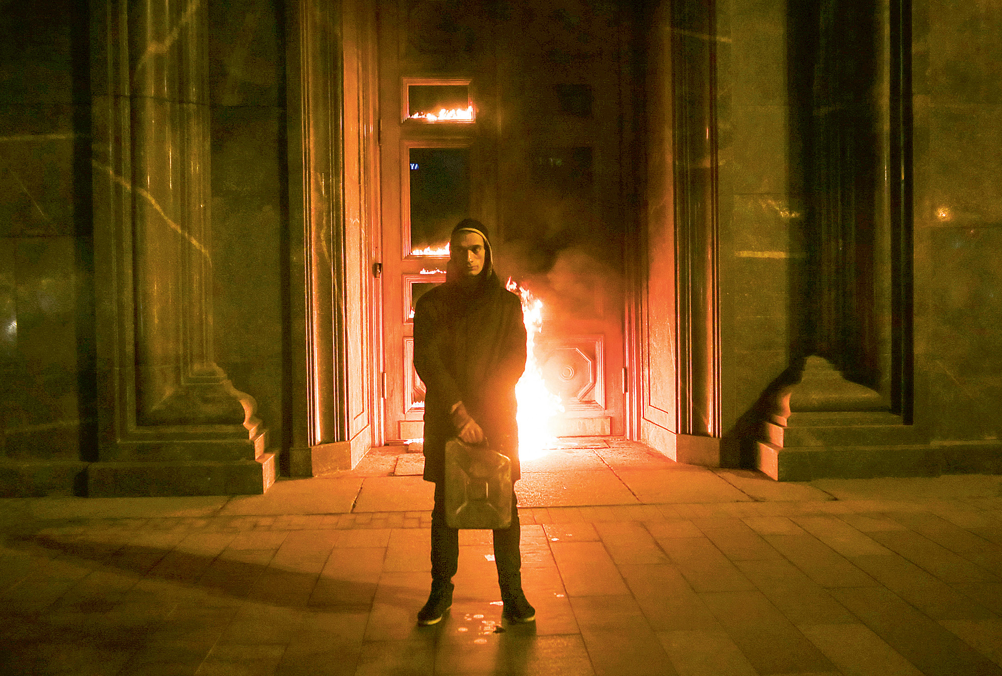 2015-ųjų lapkričio 9 d. apie 1 val. po vidurnakčio P. Pavlenskis užsuko į kavinę Maskvos centre. Tai buvo apniukusi, nevėjuota ir drėgna naktis, kokios įprastos vėlyvą rudenį. Liesas vyras įkritusiais skruostais ir įdubusiomis akimis vilkėjo juodus džinsus, juodą paltą, juodus sportbačius ir juodą žieminę kepurę su ausinėmis. Nešėsi seną skardinį degalų kanistrą.