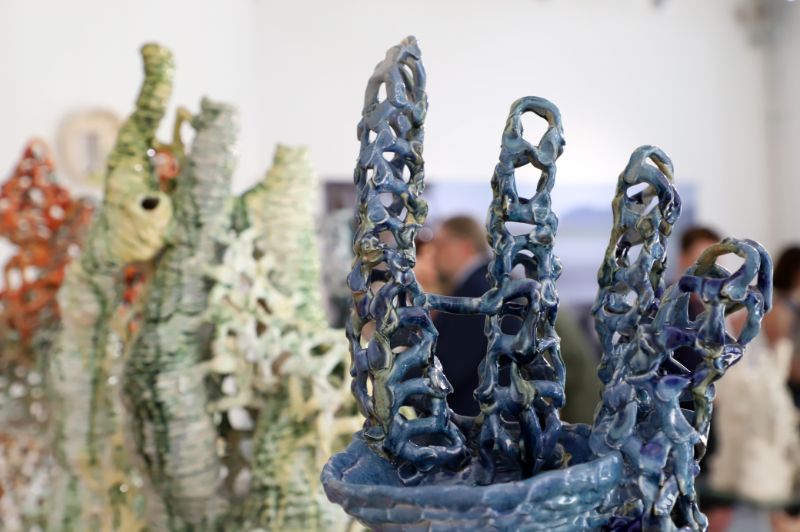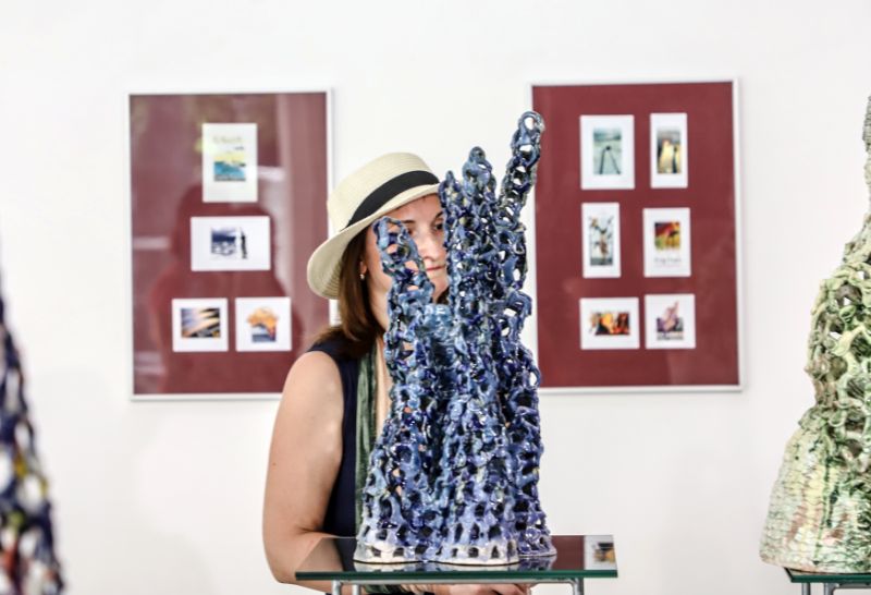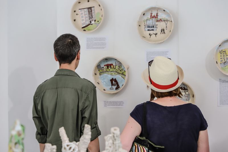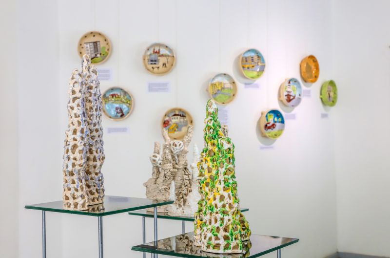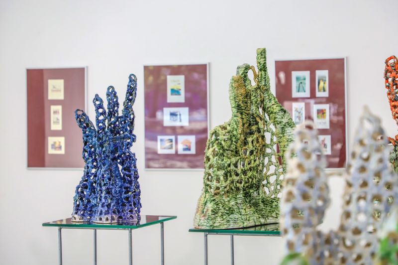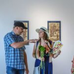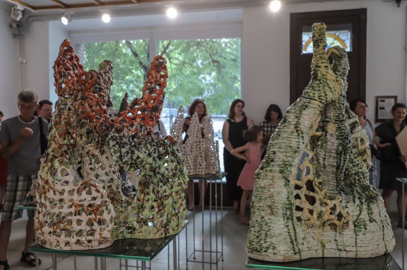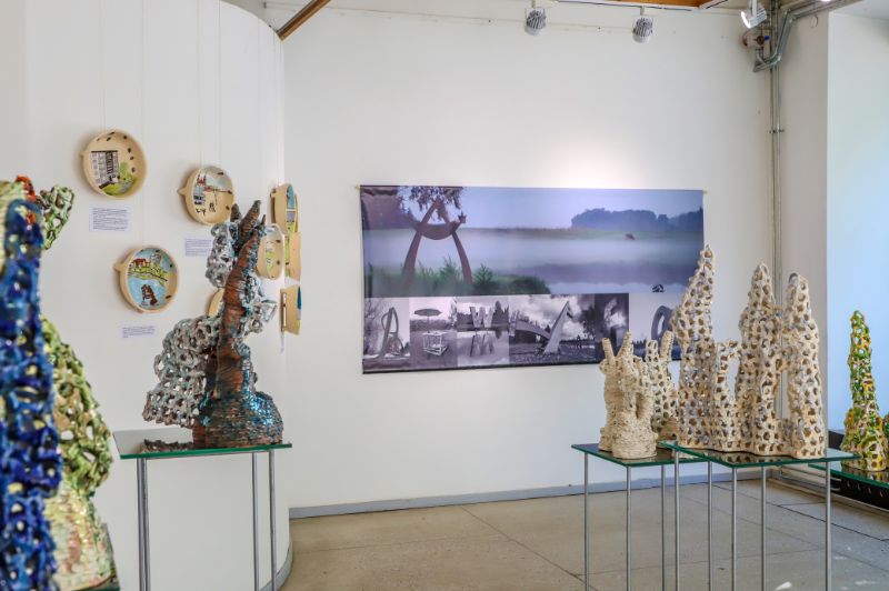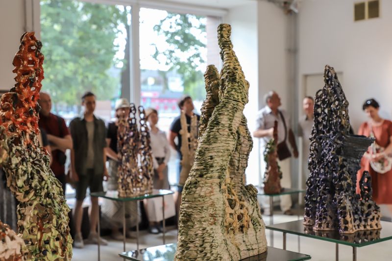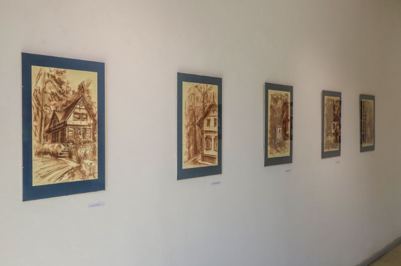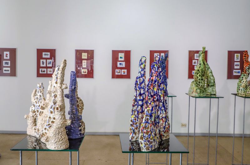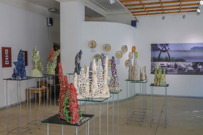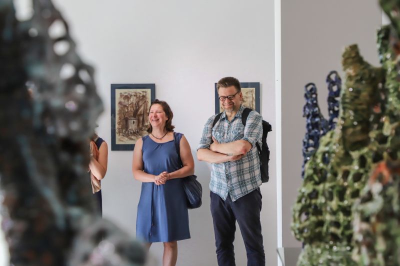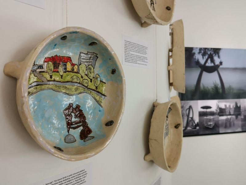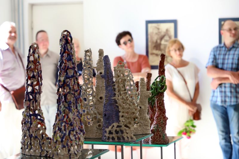 Pažvelgus pro didžiulius langus Laisvės aikštėje matyti, kaip darniai galerijos XX erdve dalijasi ekslibrisai ir keramika, piešiniai ir skulptūros. Čia iki liepos 15-osios jaukiai įsikūrę grafiko, žinomo ekslibrisų kūrėjo panevėžiečio Henriko Mazūro bei jo sūnaus keramiko, skulptoriaus Giedriaus Mazūro kūriniai.