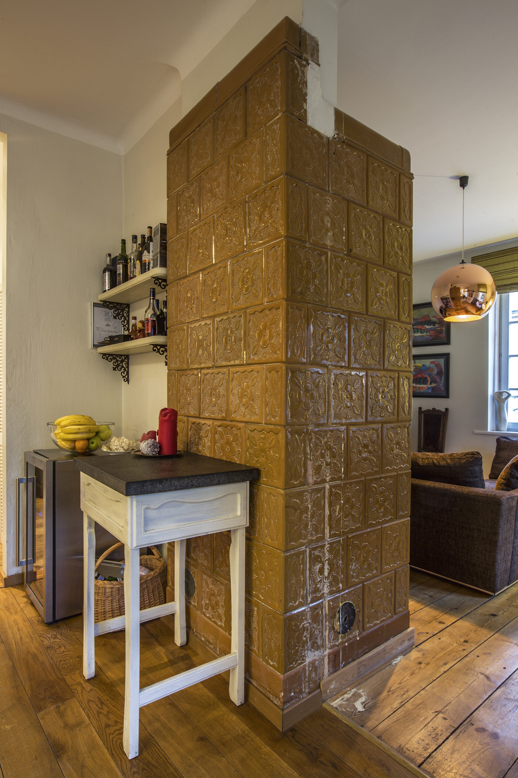 Dar vienas žvilgsnį iškart prikaustantis objektas didžiojoje buto erdvėje – švelniai rusva glazūruotų koklių krosnis, iš dalies atskirianti virtuvės-valgomojo ir poilsio zonas. Tiesa, savo tiesioginės funkcijos ji nebeatlieka – anksčiau buvusi dujinis „pečius“, dabar yra tiesiog autentiškas „buto paveldo“ objektas. Šeima svarstė krosnyje įkomponuoti židinį, nes išėjimas į kaminą likęs, tačiau nugalėjo saugumas – mediniame name būtų lengvabūdiška neįvertinti gyvos ugnies keliamo pavojaus.