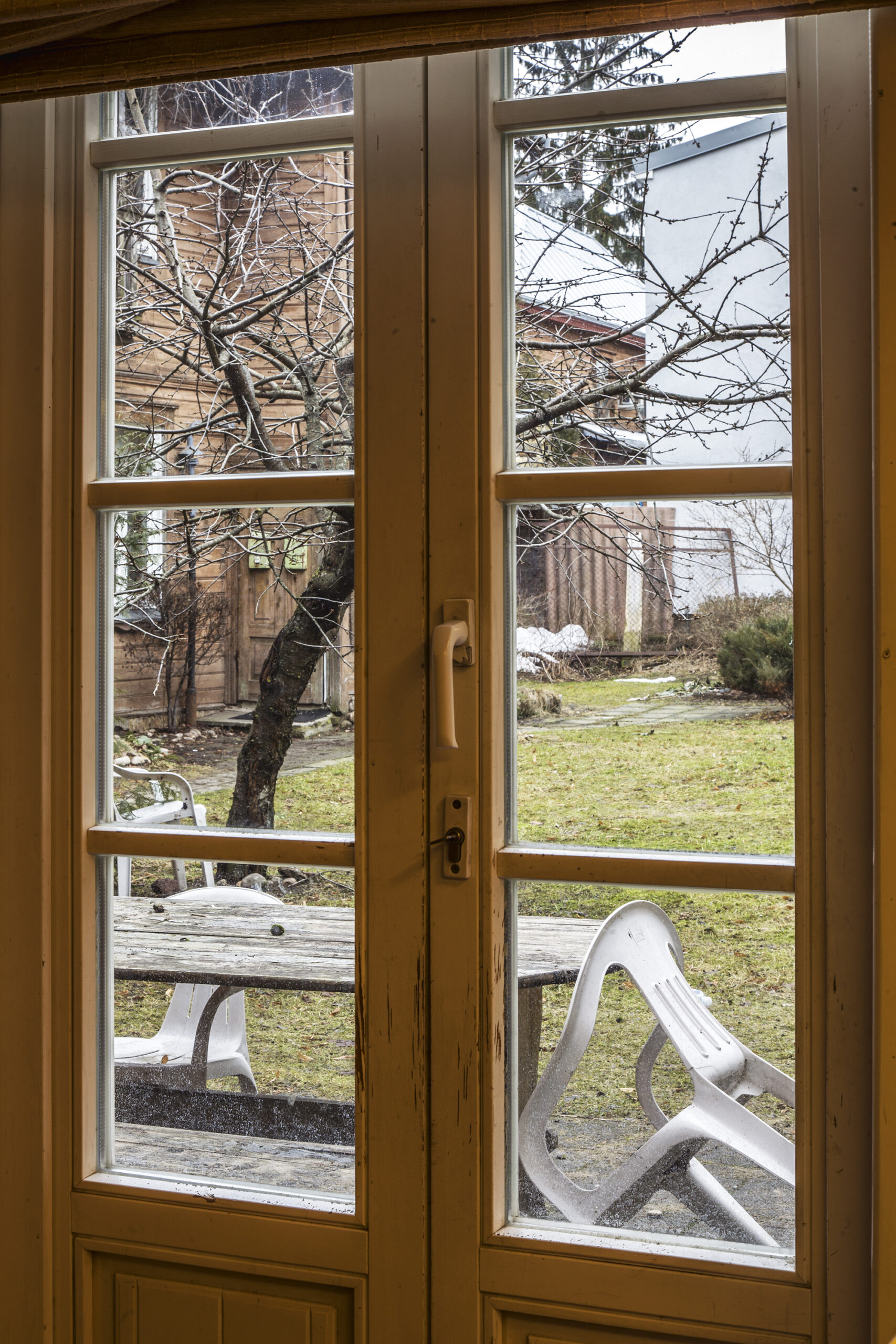 Kol kalbamės, pro langus žvelgiame į vidinį kiemą. Būtent į jį, kai orai atšyla, atveriamos iš valgomojo zonos vedančios durys ir nemažai veiksmo keliasi į lauką. Kiek atokiau nuo kieme saulės lūkuriuojančių lauko baldų auga nemažas vaismedis. „Šią trešnę dar mano tėvai sodino, kasmet spėjame nuo jos prisiskinti uogų, kol paukščiai nenulesė“, – mostelėjusi į dar vieną „paveldo objektą“, tik jau kieme, šypteli G. Akcijonaitė.