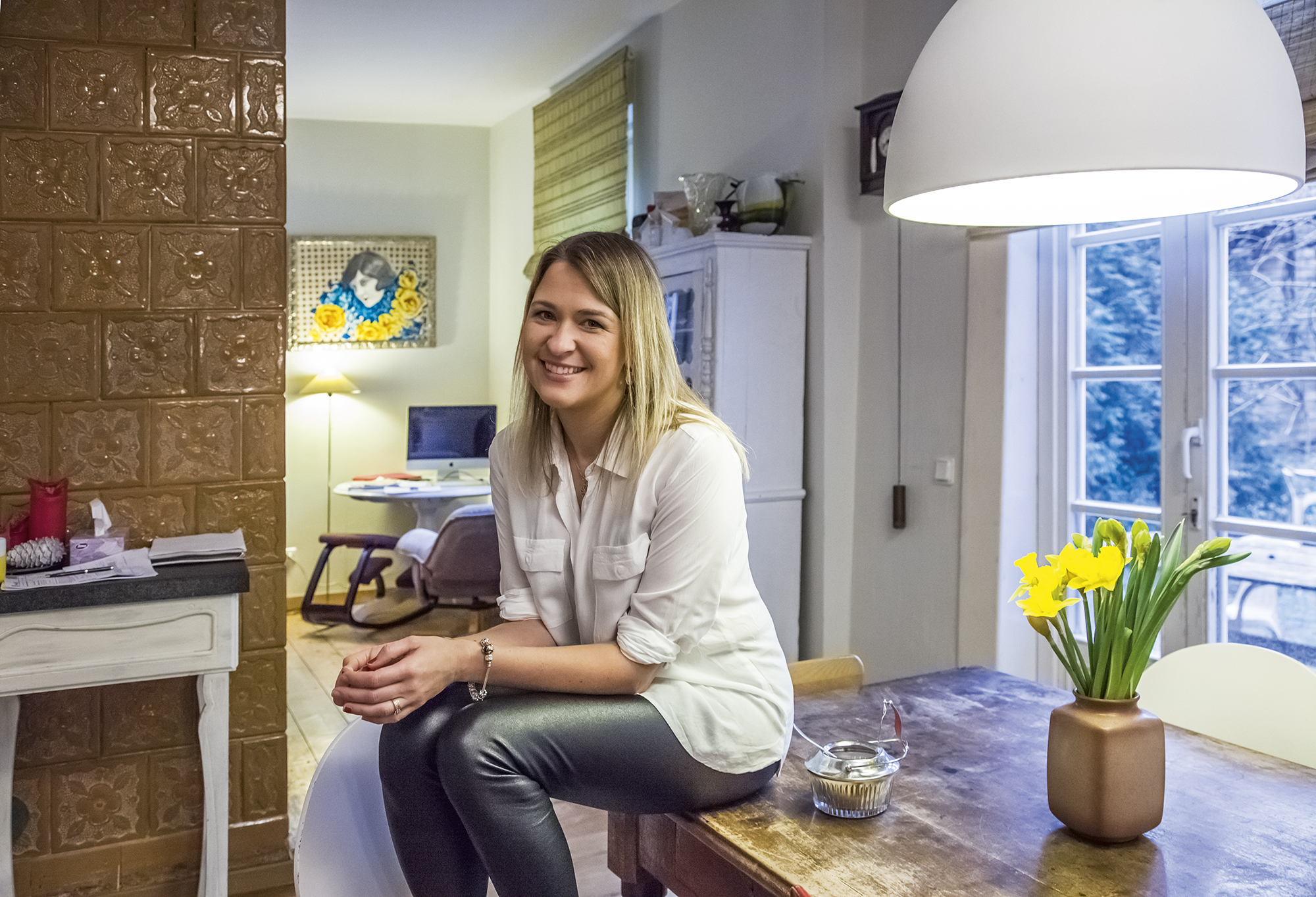 Paklausta, kiek interjere atsispindi jos ir vyro pomėgiai bei veikla (Aidas įsisukęs į kavinių ir restoranų verslą), šeimininkė gūžtelėja pečiais, kad ne itin. Kita vertus, prieskonių ir pagardų pilnos atviros lentynos, šefo peiliai ant sienos byloja, kad maistas čia ruošiamas. O štai kino plakatų, nepaisant moters mėgstamos veiklos, nėra, tačiau įvairiausių meno kūrinių – keliančių emocijas, neatsitiktinių – nemažai. Didžiausias ir įspūdingiausias kabo poros miegamajame. Tai fotomenininko, šeimos bičiulio Algio Kriščiūno nutapytas ketveriukės portretas – jame tėvai ir abu berniukai joja ant… begemoto. Žvelgiant į šį darbą tikrai sunku sulaikyti šypseną.