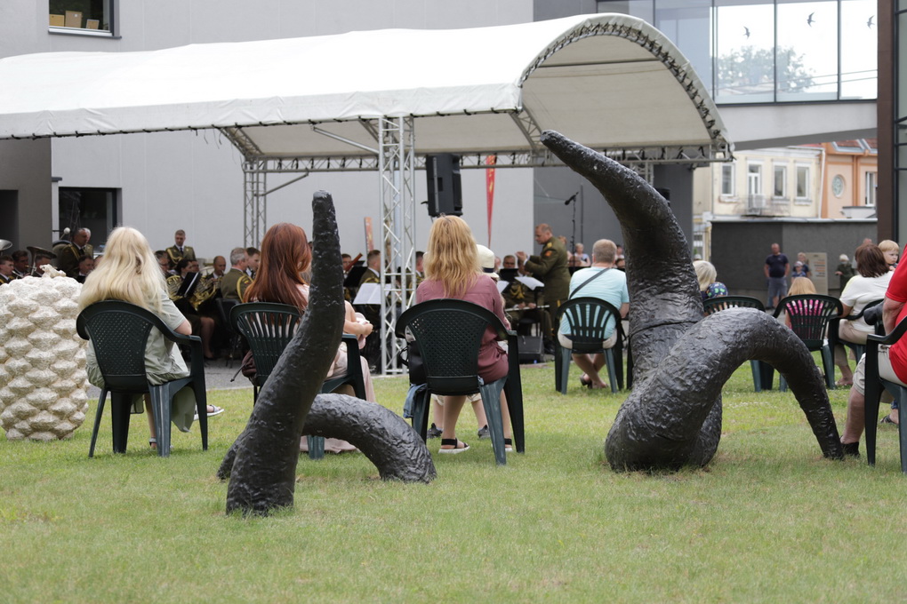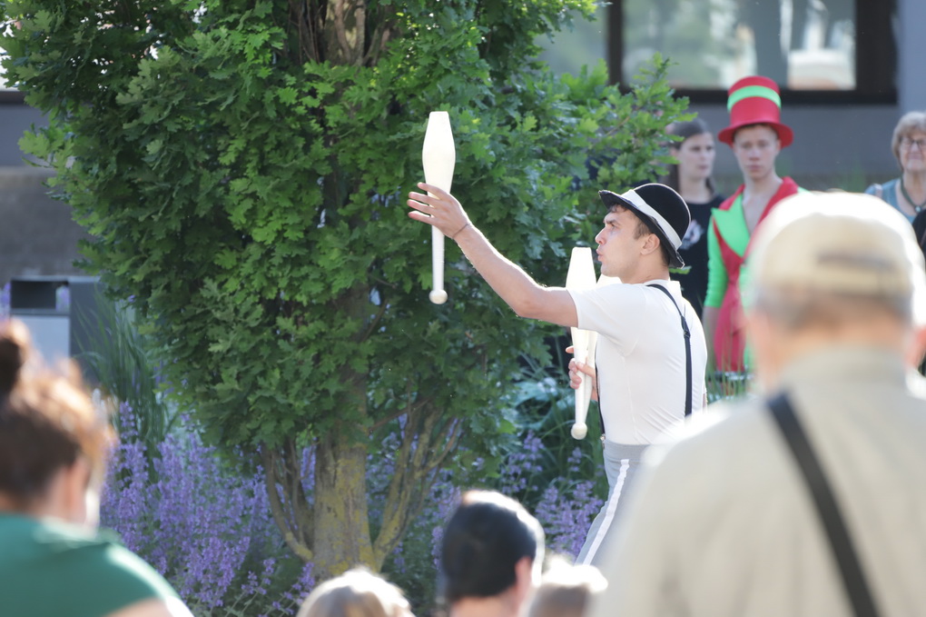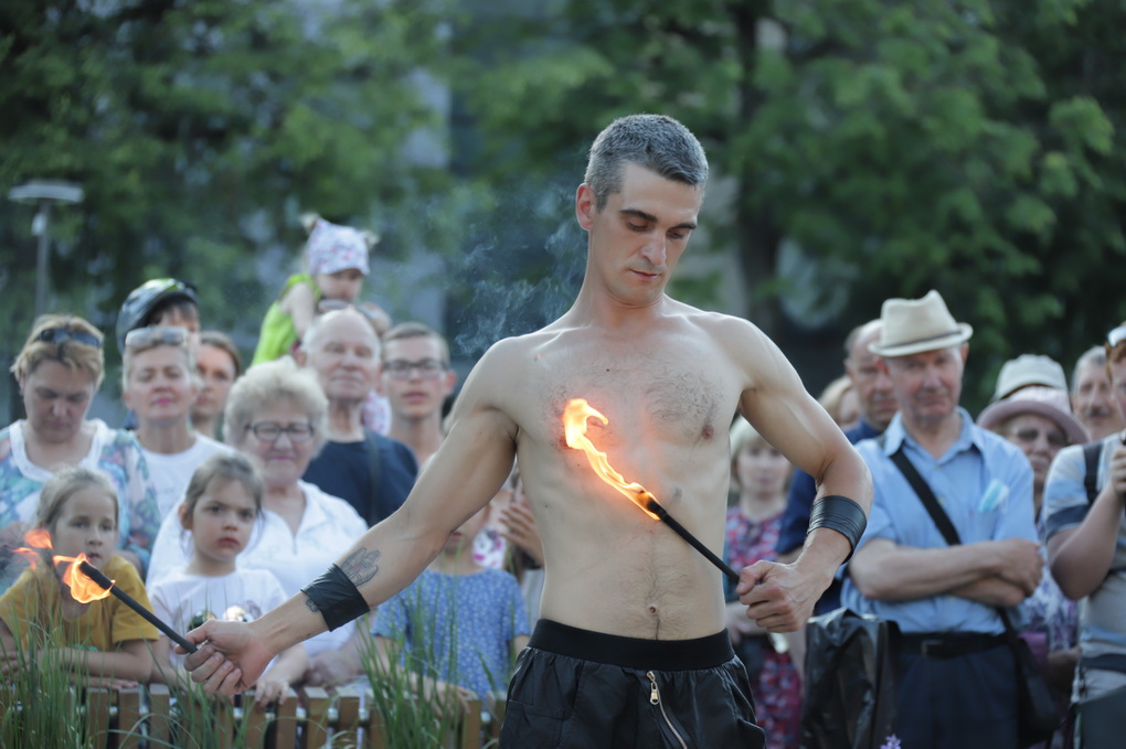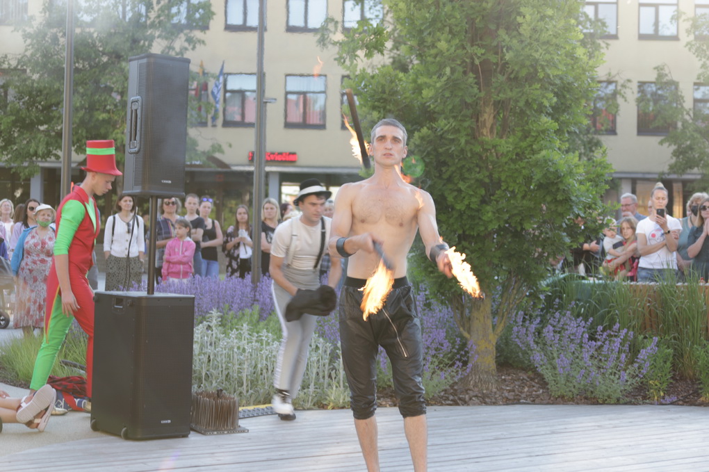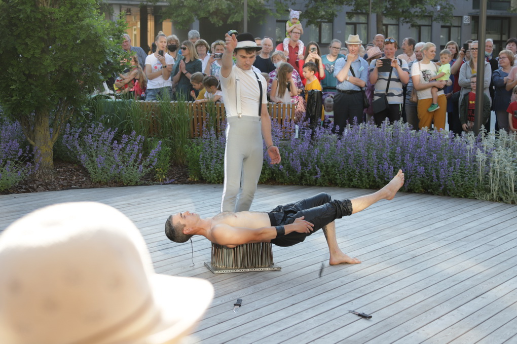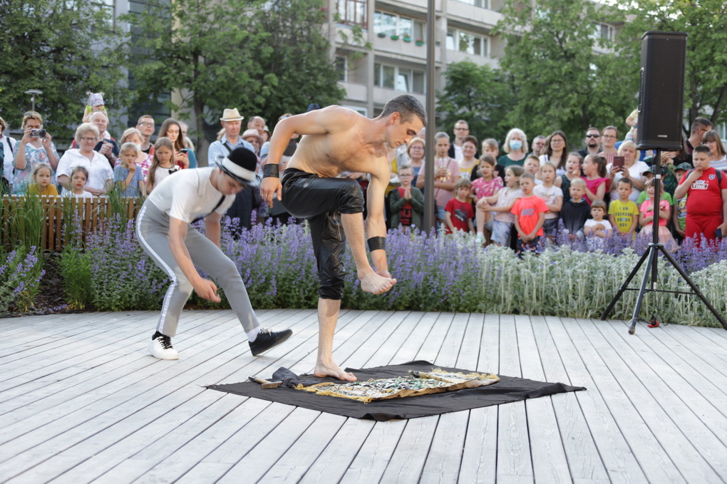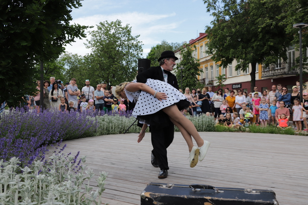 Vakare aikštėje skraidė muilo burbulai, triukus rodė Alytaus, Šakių gatvės cirko virtuozai, Kauno mimų teatro aktoriai. O Dailės galerijos kiemelyje būrys panevėžiečių mėgavosi ypatingais „Dūdų vasaros“ svečiais – Lietuvos kariuomenės orkestro programa.