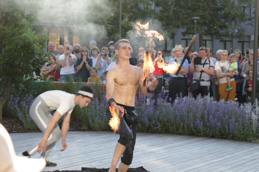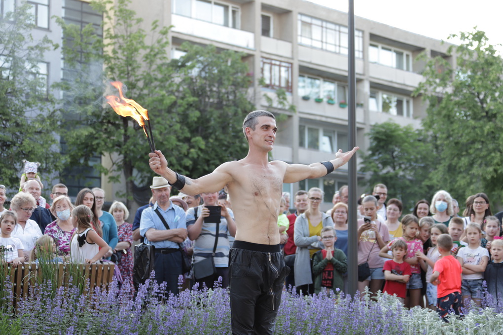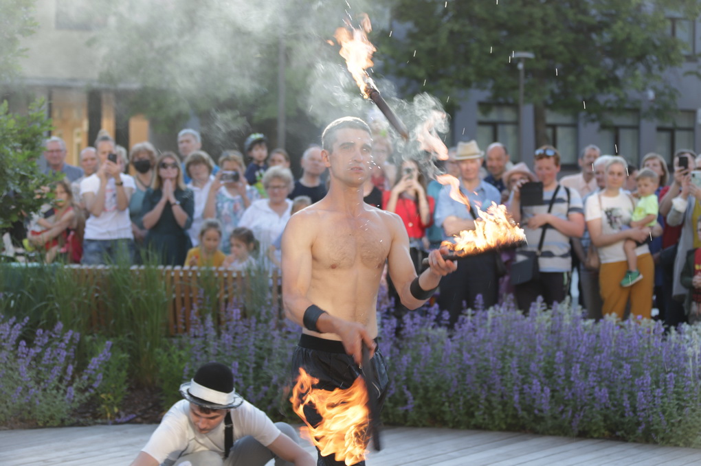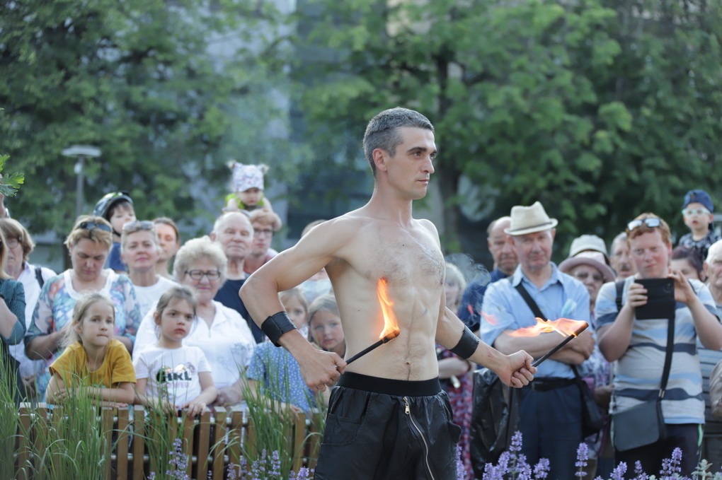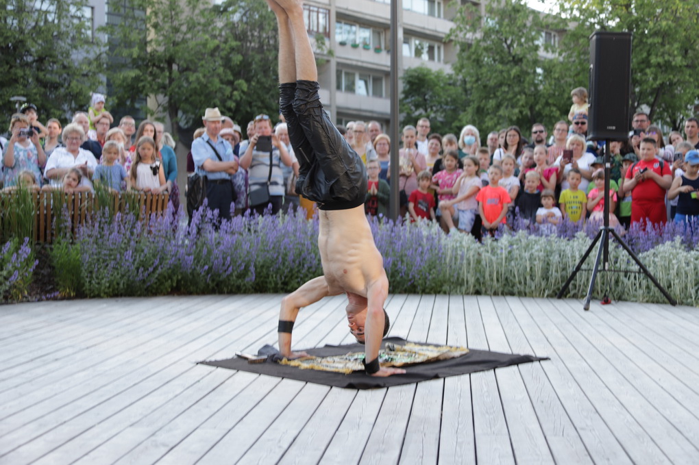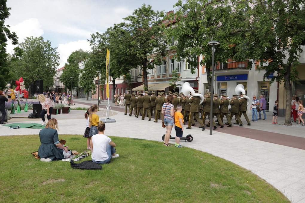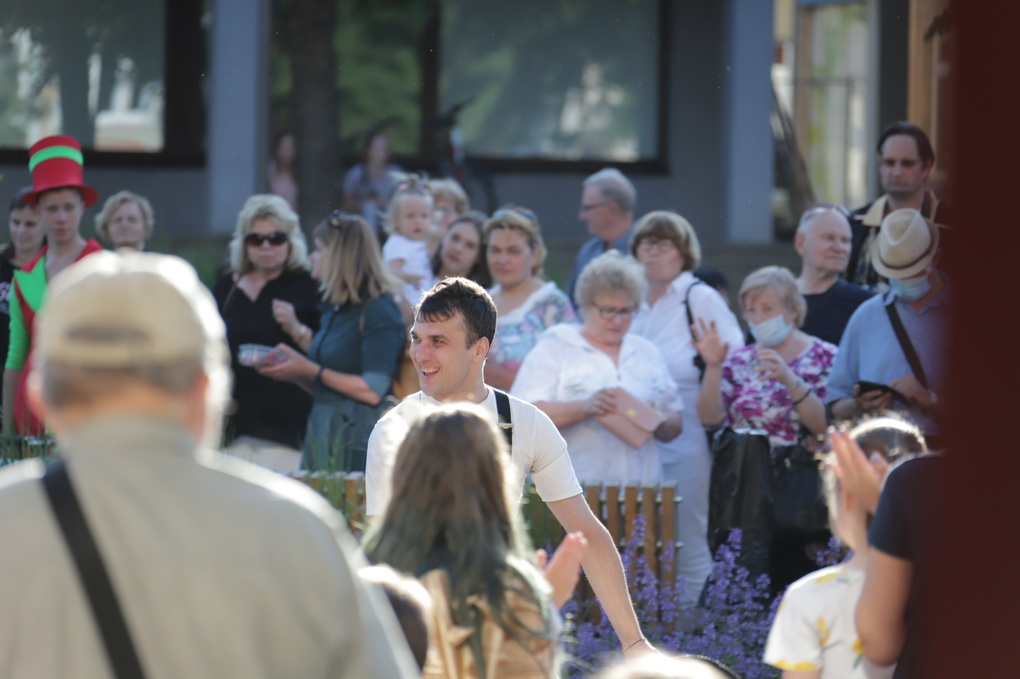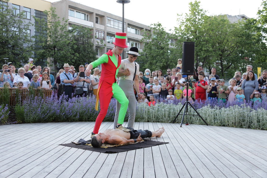 Vakare aikštėje skraidė muilo burbulai, triukus rodė Alytaus, Šakių gatvės cirko virtuozai, Kauno mimų teatro aktoriai. O Dailės galerijos kiemelyje būrys panevėžiečių mėgavosi ypatingais „Dūdų vasaros“ svečiais – Lietuvos kariuomenės orkestro programa.