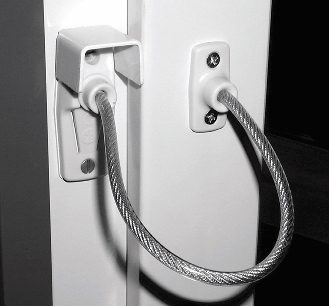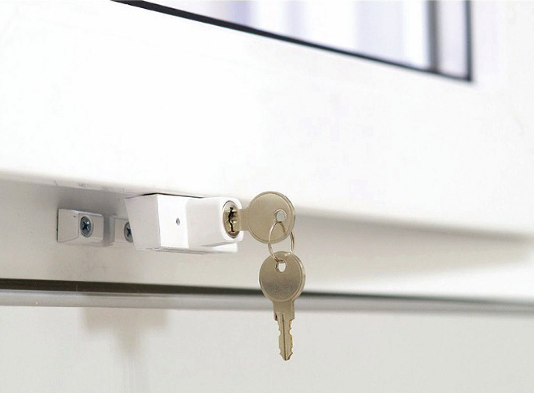 2. Varčios atidarymo užraktas – varstomos dalies apatiniame kampe (rankenos pusėje) prie staktos prisukama papildoma antviršinė detalė su užraktu, kuri neleidžia visiškai atidaryti lango, tačiau netrukdo atlenkti varčią norint išvėdinti patalpą. Varčią atidaryti galima tik atrakinus užraktą.