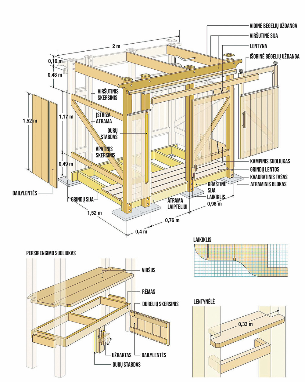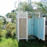 Jei planuojate dušu naudotis kiek dažniau, neapsieisite be drenažo. Per dušo perimetrą reikės nukasti viršutinį grunto sluoksnį – maždaug 10–15 cm – ir atsivėrusį plotą užpildyti smulkiu sutankintu smėliu. Tada ant jo klojamas sluoksnis skaldos, o jau ant jos, prie žemėn įbetonuotų polių, tvirtinamos dušo sienelės ir grindys. Grindims patogu naudoti impregnuotą medieną arba jau minėtas terasines lentas.