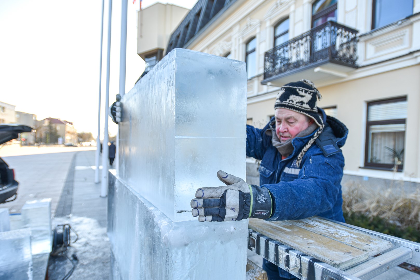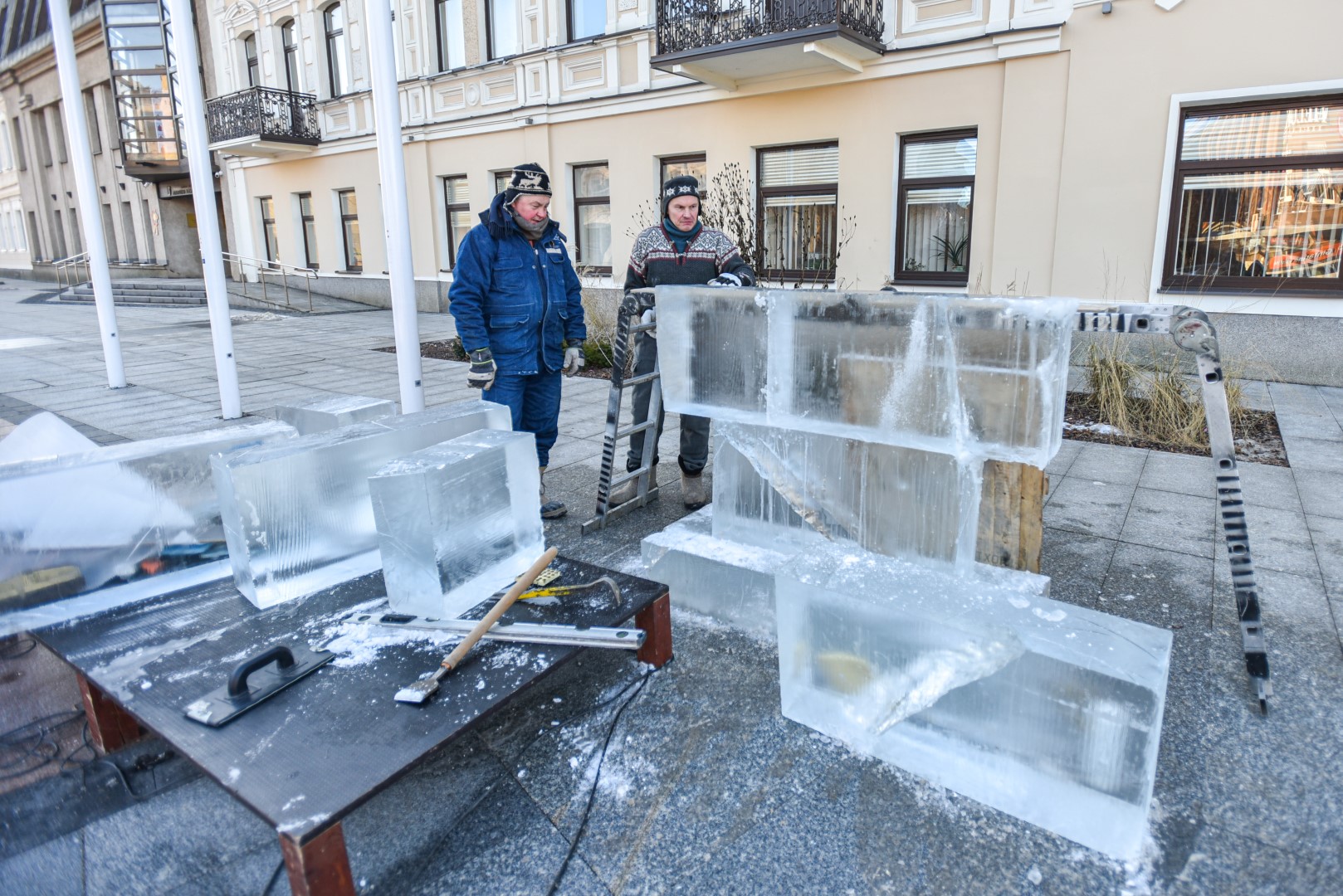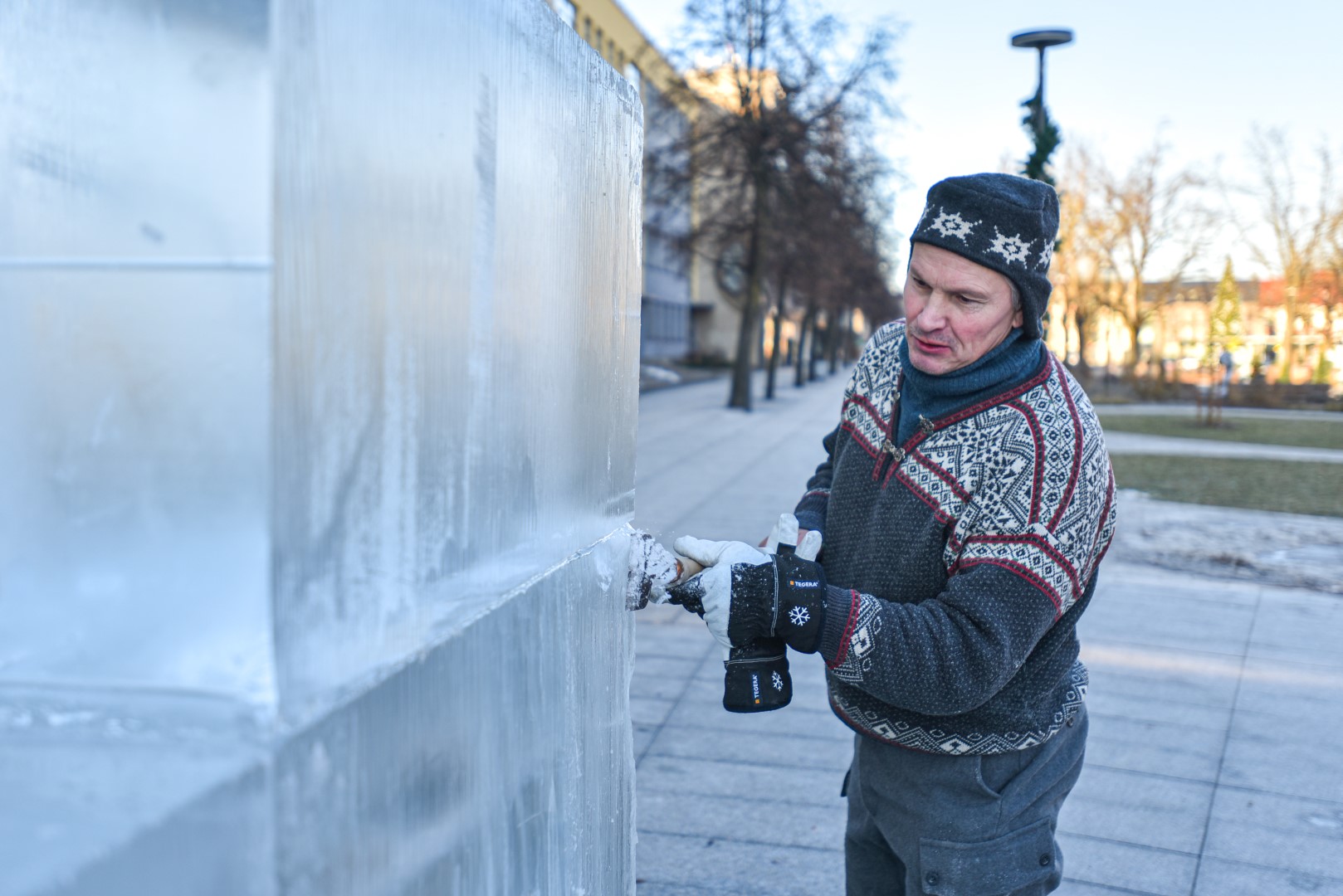 Prie įspūdingos skulptūros K. Musteikis darbuojasi kartu su broliu Vytautu. Nuo antradienio Panevėžio centre besidarbuojantys vilniečiai broliai lede baigia išdrožti herbą – kaip pagarbos ženklą prieš 31–erius metus paguldžiusiems galvas dėl Lietuvos.