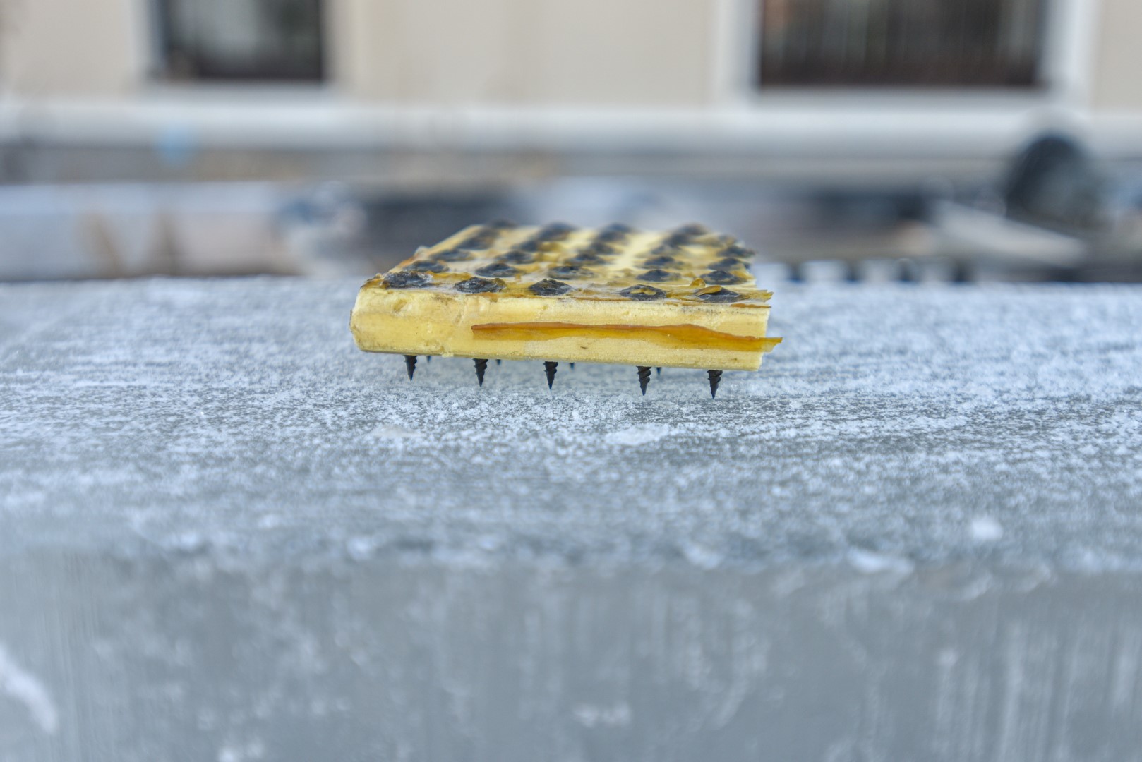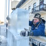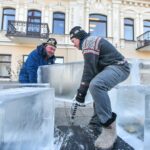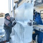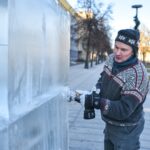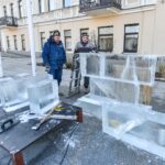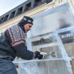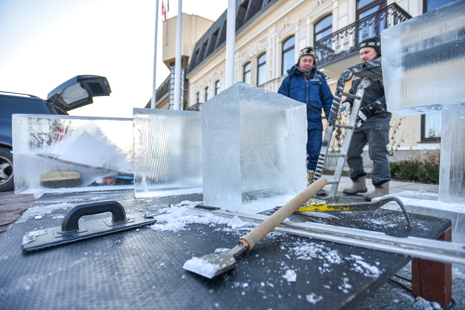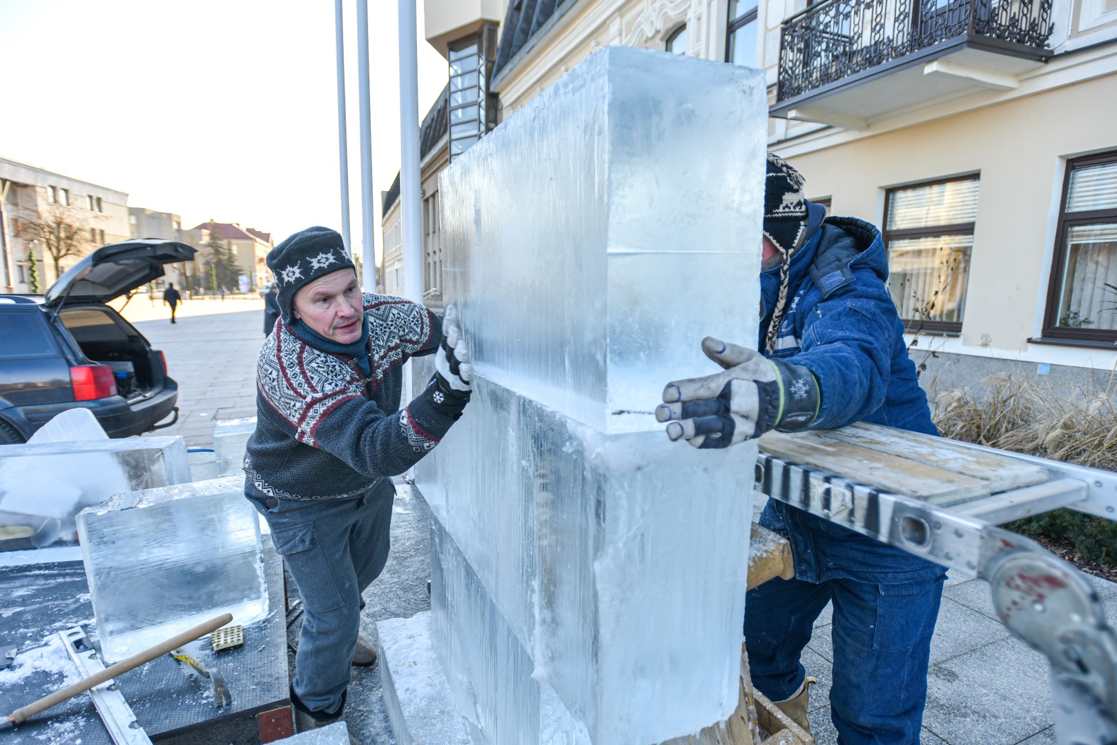 Prie įspūdingos skulptūros K. Musteikis darbuojasi kartu su broliu Vytautu. Nuo antradienio Panevėžio centre besidarbuojantys vilniečiai broliai lede baigia išdrožti herbą – kaip pagarbos ženklą prieš 31–erius metus paguldžiusiems galvas dėl Lietuvos.