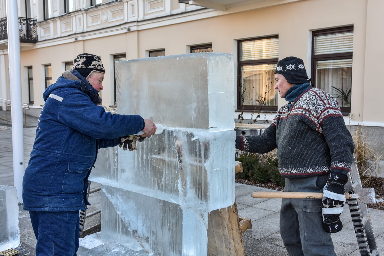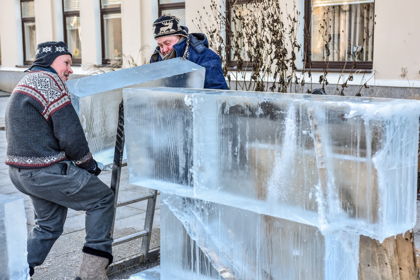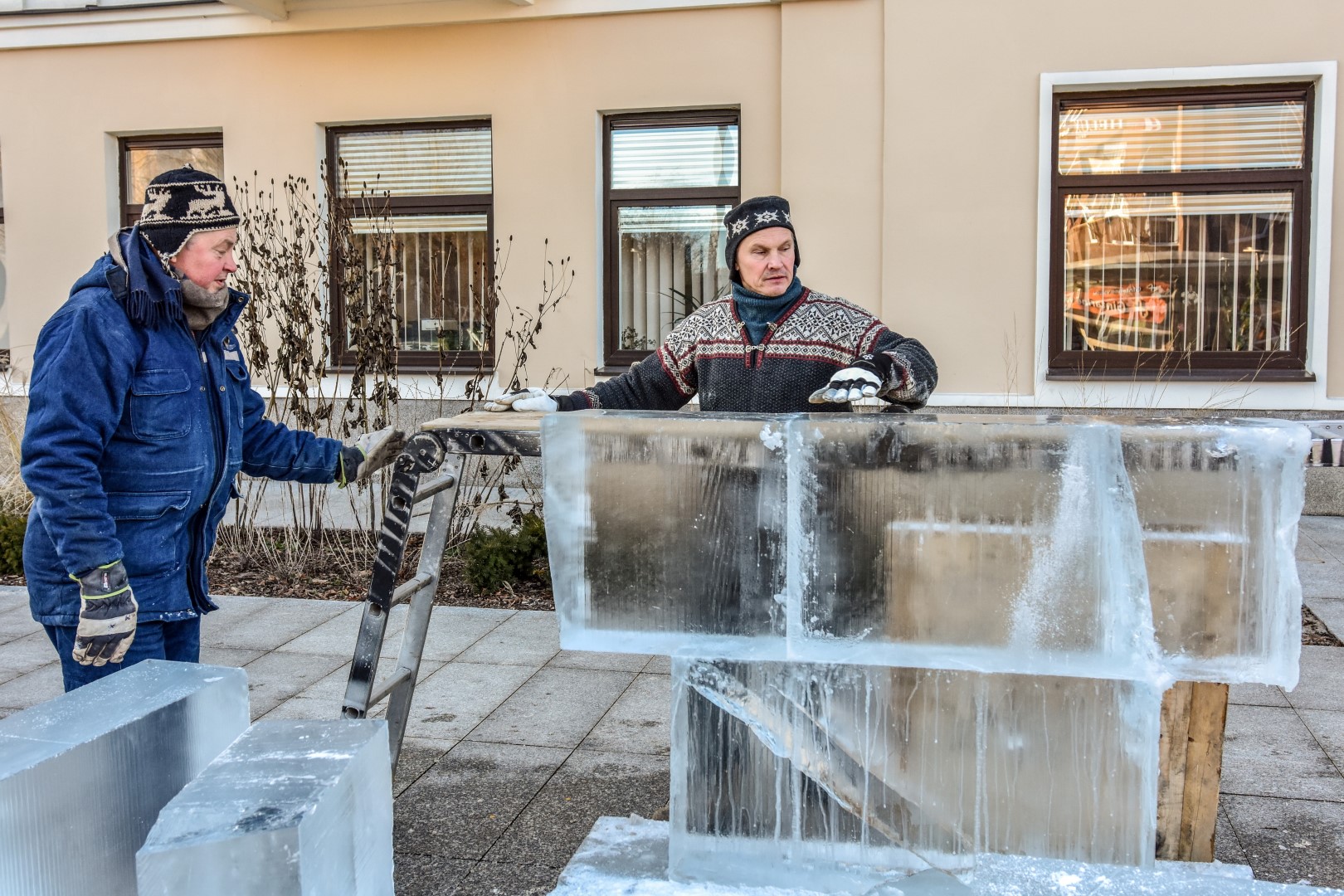 Panevėžio Laisvės aikštėje jau antrą dieną prie įstabios ledo skulptūros triūsiančių brolių menininkų Kęstučio ir Vytauto Musteikių duetas žinomas plačiame pasaulyje.