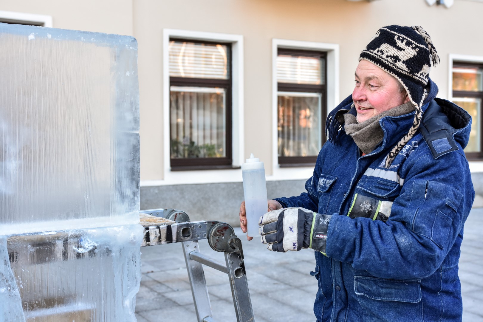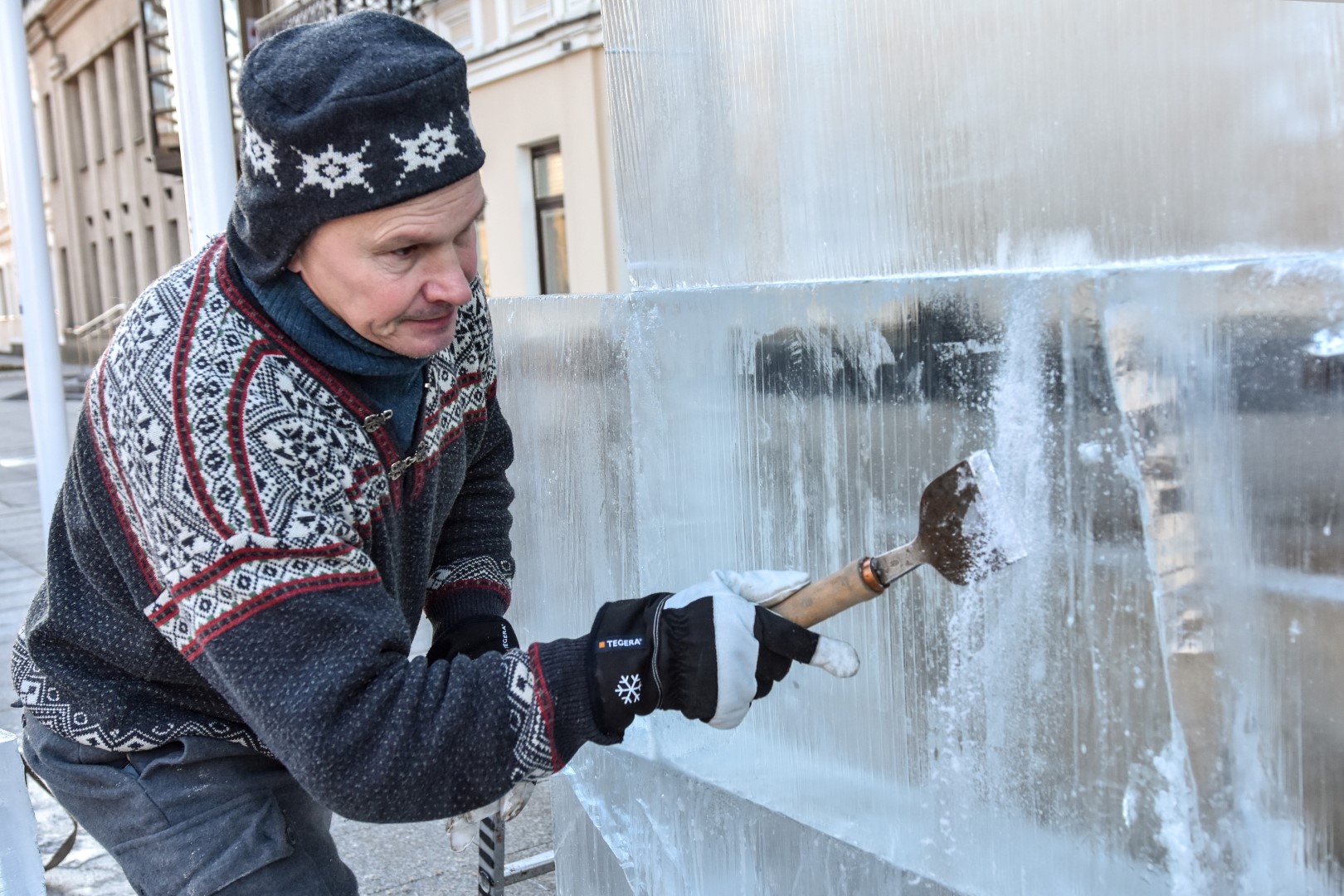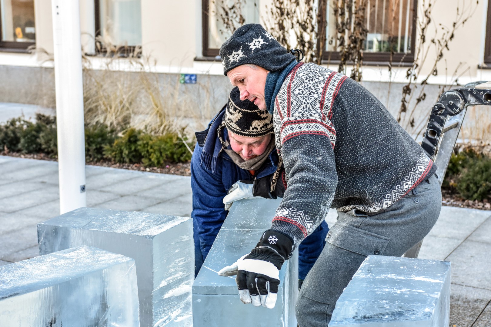 Panevėžio Laisvės aikštėje jau antrą dieną prie įstabios ledo skulptūros triūsiančių brolių menininkų Kęstučio ir Vytauto Musteikių duetas žinomas plačiame pasaulyje.