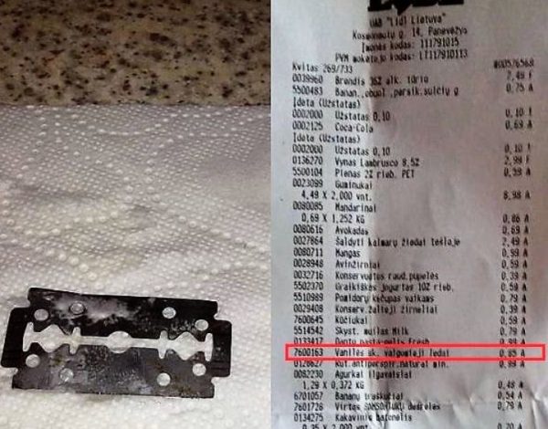 Juose moteris rado pavojingą įrankį – skustuvo peiliuką. Kokiais keliais jis pateko į gardėsį, kol kas nežinoma. Tačiau tai sukėlė didžiulį išgąstį pirkėjos Erikos šeimai.