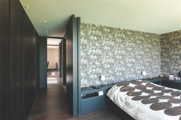 Tamsių – antracito, deginto ąžuolo – spalvų paletė būdinga visoms namo erdvėms, net ir higienos patalpoms. Pagrindiniame miegamajame už slankiųjų durų tęsiama integruotų spintų seka, prasidedanti jau antrojo aukšto prieškambaryje. Miegamojo patalpoje vyrauja saikinga spalvinė paletė, kiek pagyvinama raštuotų tapetų. Visą sienų perimetrą juosia žemos funkcionalios spintelės, ant kurių patogu norimoje vietoje išdėstyti šviestuvus bei įvairius smulkius daiktus.