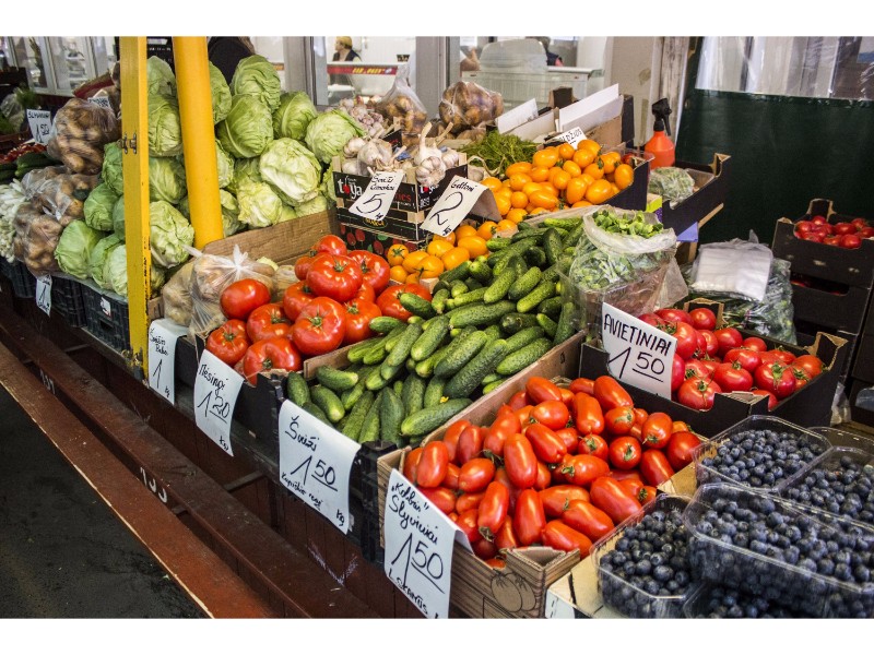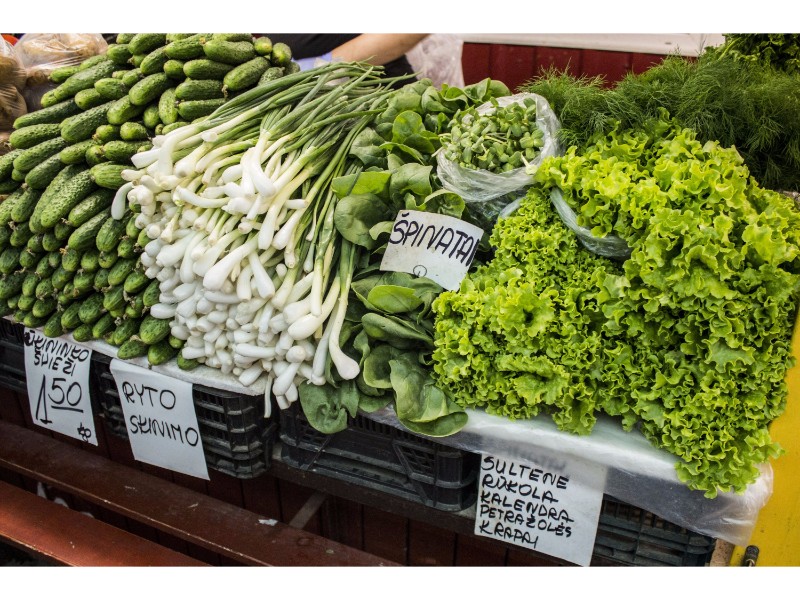 Turgaus lentynos nukrautos ne tik uogomis, bet ir šviežiomis daržovėmis bei žalumynais. Jų kainos – labai įvairios. Pavyzdžiui, šviežių bulvių kilogramas kainuoja apie vieną eurą, už kopūstų kilogramą teks atseikėti nuo aštuoniasdešimt centų iki vieno euro.