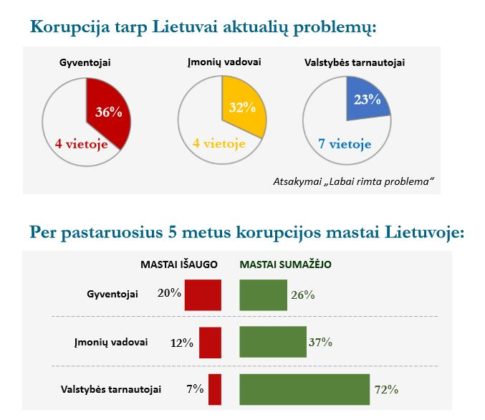 36 proc. gyventojų ir 32 proc. įmonių vadovų korupciją laiko rimta problema Lietuvoje – tarp kitų problemų korupcija atsidūrė 4 vietoje (po mažų atlyginimų, kylančių kainų ir emigracijos). Tarp valstybės tarnautojų korupciją, kaip labai rimtą problemą, vertina 23 proc. respondentų – šioje tikslinėje grupėje korupcijos problema yra 7 vietoje.