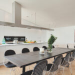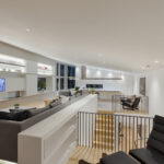 Antro aukšto grindys įrengtos ne viename lygyje, taip subtiliai be sienų atskiriant maisto ruošimo, valgymo, poilsio ir darbo interjero erdves. Be to, svetainės zonos iškėlimas leido išvengti laiptelio prie išėjimo į terasą ir smarkiai pagerino apžvalgą sėdint ant integruotos 5,3 m ilgio sofos, kuri dar apšviesta iš apačios. Dar vienas įspūdingo ilgio daiktas čia – 5 metrų gartraukio gaubtas, pakibęs virš tokio pat ilgio virtuvės salos, taip pat padeda sustiprinti mastelio įspūdį.