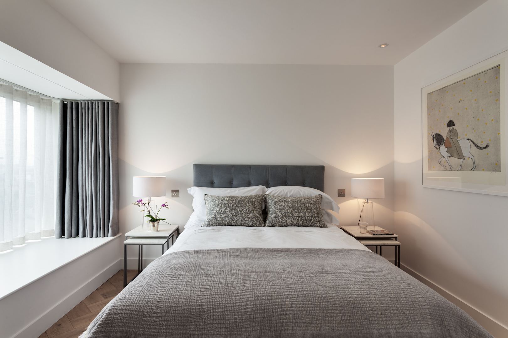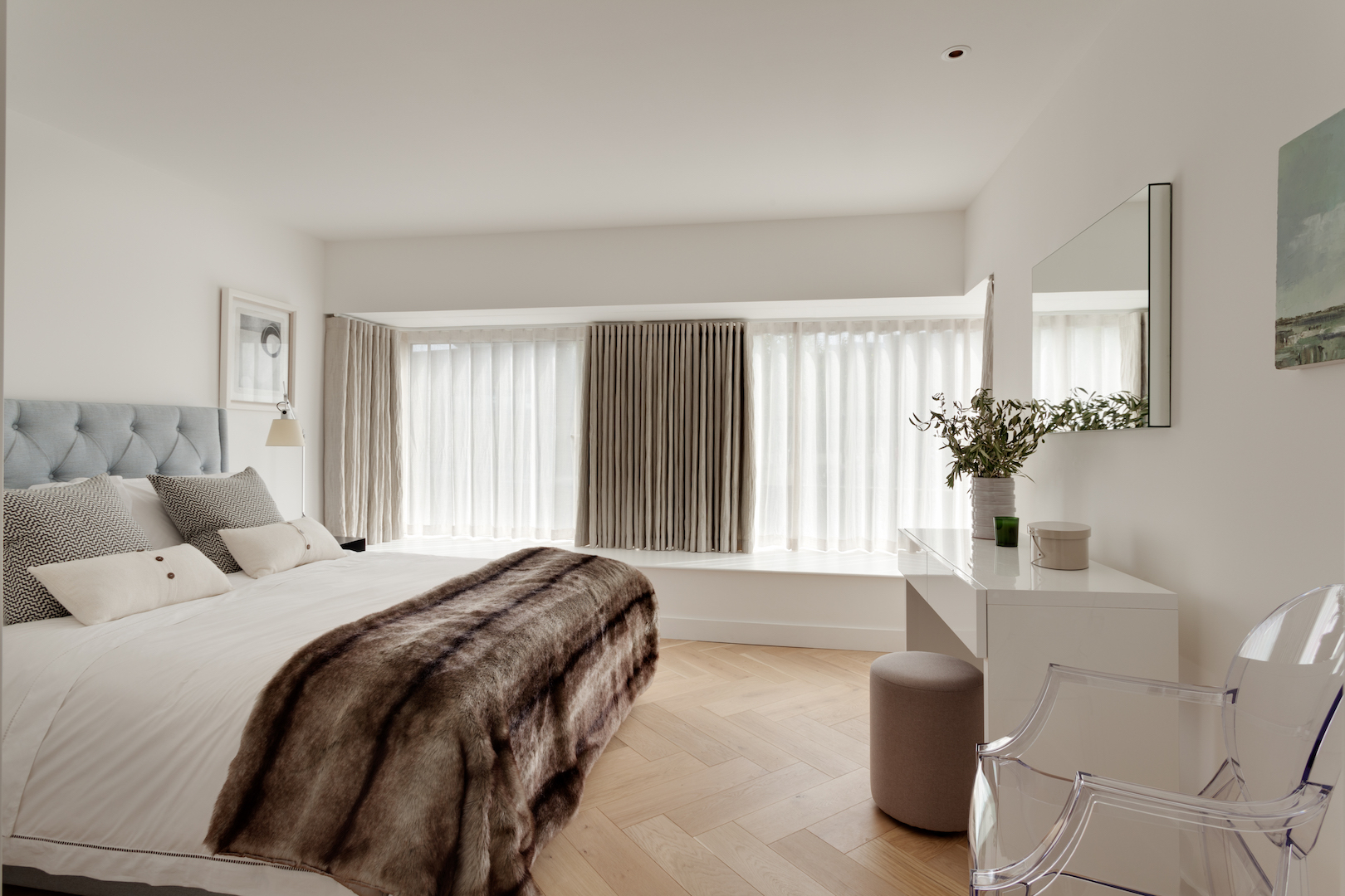Apatiniame aukšte įrengtas šeimininkų miegamasis, kurio virš vandens pakibusiame vitrininiame erkeryje smagu įsitaisyti apskritoje Antonio Citterio dizaino sofoje ir mėgautis Canaletto teptuko verta panorama. Dar du miegamieji taip pat įrengti pirmajame aukšte.