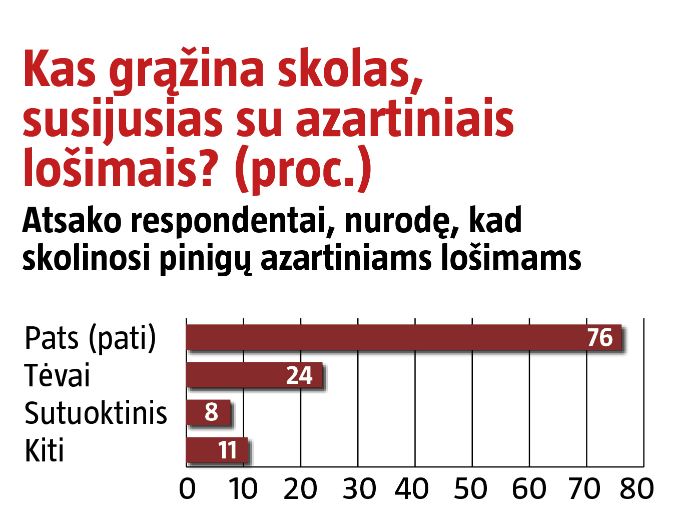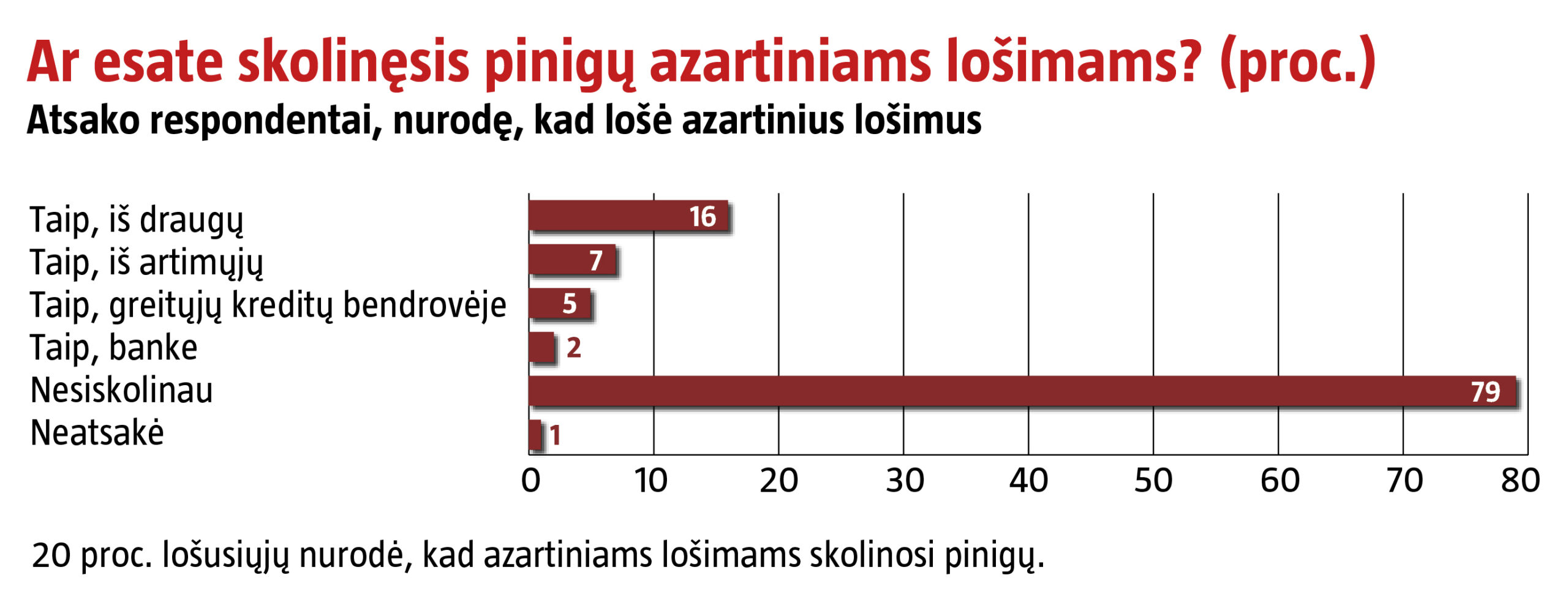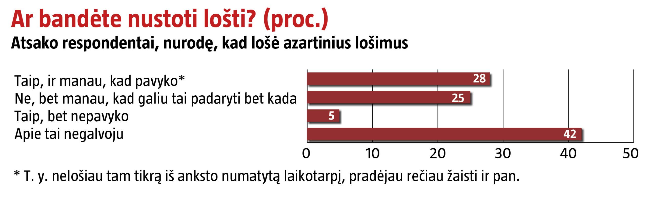 Nustoti lošti azartinius lošimus nesėkmingai bandė 5 proc. apklaustųjų. Penktadalis lošėjų pripažino skolinęsi pinigų iš draugų, artimųjų, banke ar greitųjų kreditų bendrovėje.