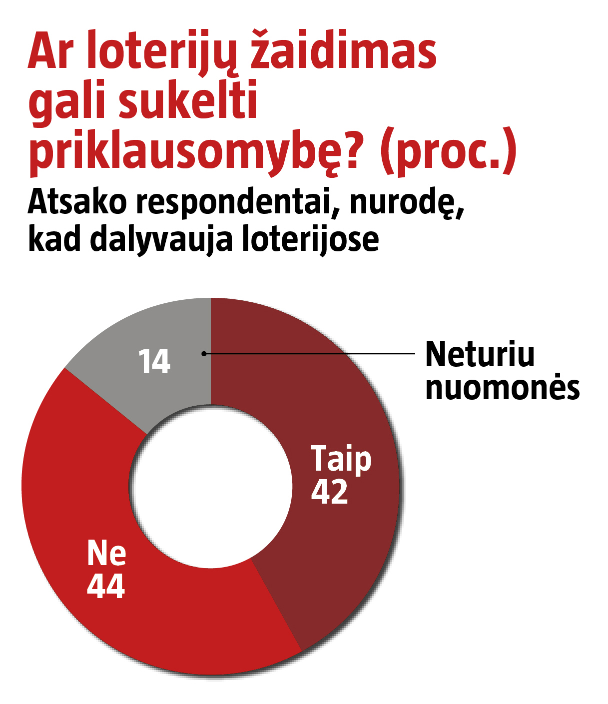 Žaidžiantys loterijose įsitikinę, kad priklausomybės rizika yra gerokai mažesnė – 42 proc. mano, kad aistra pirkti loterijos bilietus gali tapti nevaldoma, 44 proc. tokios rizikos neįžvelgia.