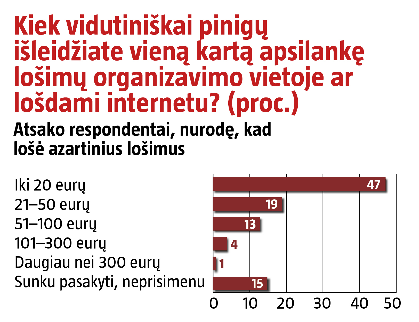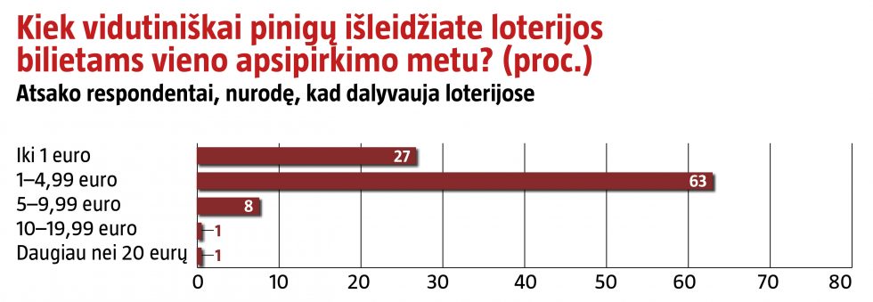 Tuo tarpu daugiau nei pusė apsilankusiųjų lošimų namuose ar lošdami internetu išleidžia daugiau nei 21 eurą arba negali tiksliai nurodyti praloštos sumos.