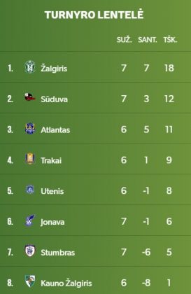 18 taškų pirmajame rate surinkęs „Žalgiris“ turnyro lentelėje užima pirmąją vietą, o „Sūduva“ (12 tšk.) yra antra.