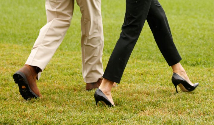 Internete pasirodė nuotraukų, kuriose M.Trump dar Baltųjų rūmų kieme matoma avinti aukštakulnius, vilkinti patrumpintas juodas kelnes, chaki spalvos švarką ir su akiniais nuo saulės.