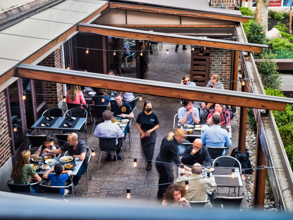 Atstumas tarp stalų turės būti toks, kad prie skirtingų stalų sėdintys lankytojai vienas nuo kito būtų nutolę ne mažesniu kaip dviejų metrų atstumu. Jei tarp stalų įrengiamos ne mažesnės nei 90 cm pločio ir 140 cm aukščio pertvaros, atstumas tarp stalų gali būti toks, kad prie skirtingų pertvaromis atskirtų stalų sėdintys lankytojai vienas nuo kito būtų nutolę ne mažesniu kaip metro atstumu.