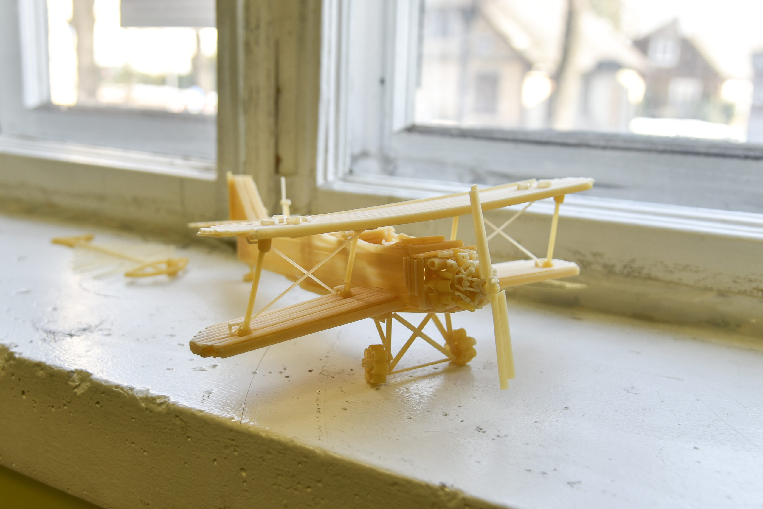 Panevėžiečio jau gana gausioje kolekcijoje įvairių formų, spalvų makaronų rankdarbiai: nuo mažo kirmeliuko iki namo, lėktuvo, garlaivio malūno, bokšto ir t.t. Visi šie darbai gana smulkmeniškai, kruopščiai suklijuoti iš mažyčių detalių. Iš makaroninio piratų laivo išlenda makaronų patrankos, sukasi sulipdyto lėktuvo propeleris. O makaroninis Havajų namelis viduje apstatytas smulkiais baldais iš makaronų.
