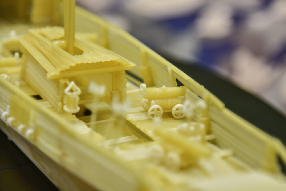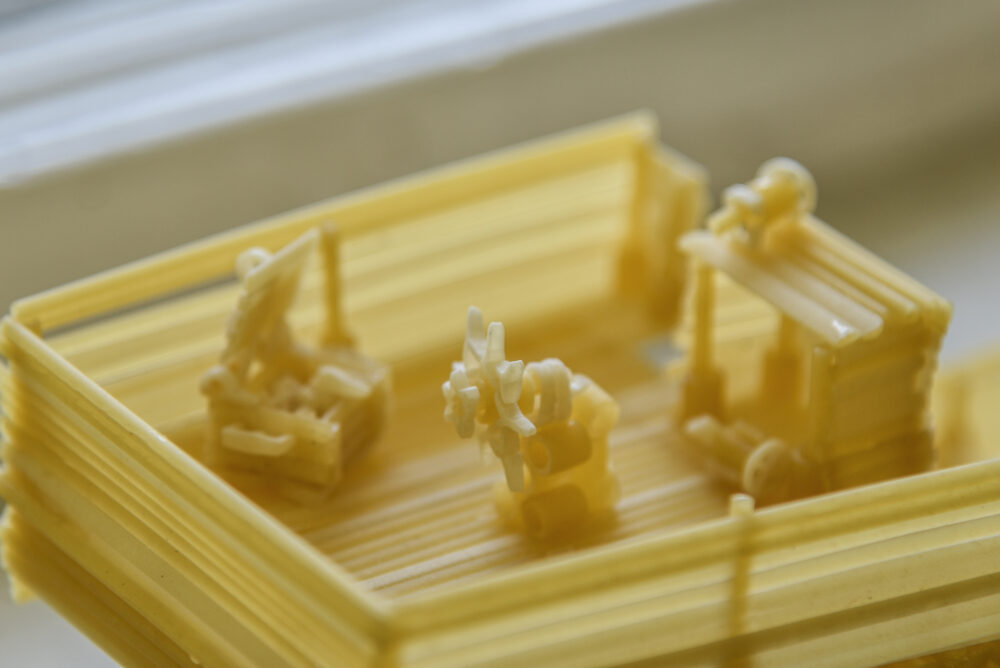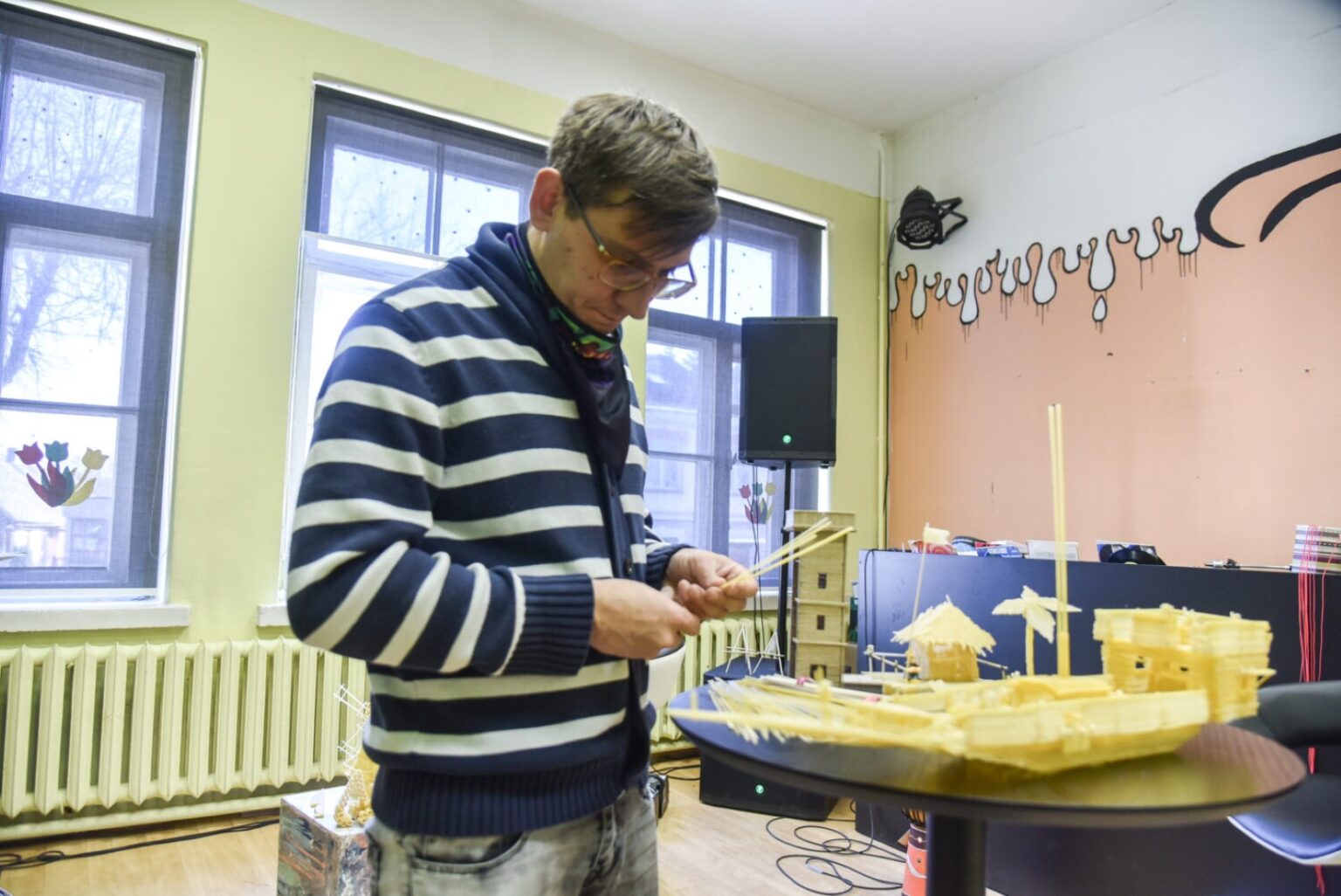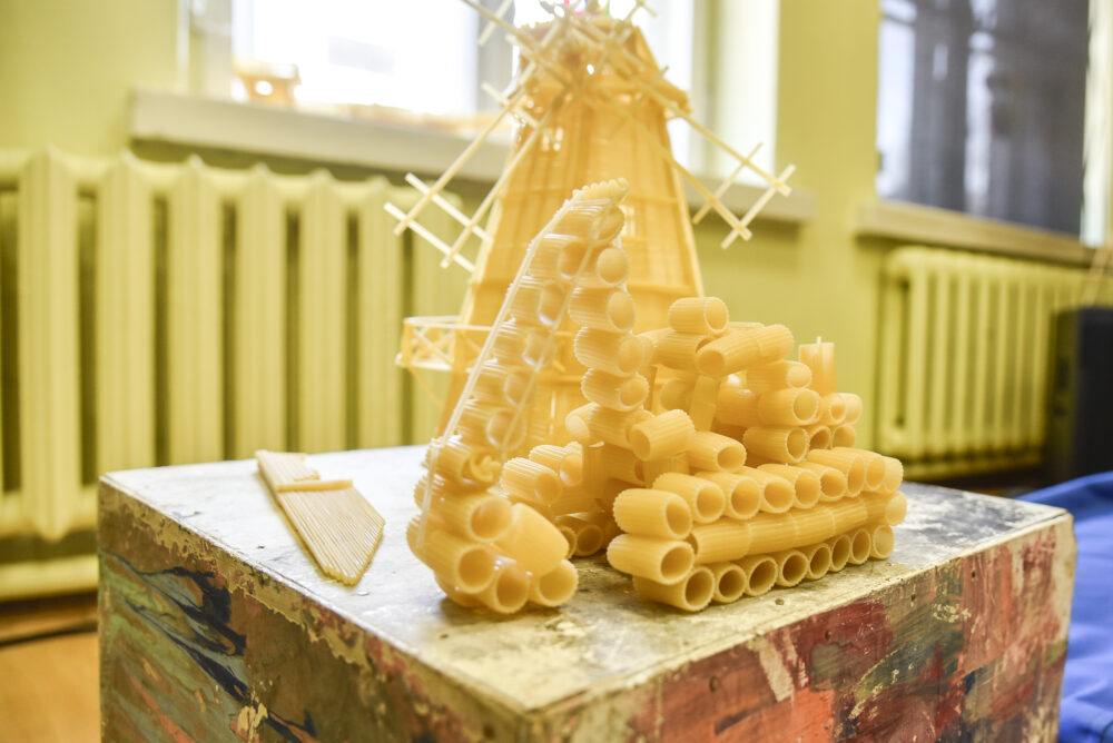 „Makaronus galima valgyti, galima kabinti kažkam ant ausų, bet galima iš jų ir ką nors įdomaus sukonstruoti“, – juokiasi Ėriškių kultūros centro darbuotojas Valdemaras Liudvinavičius.