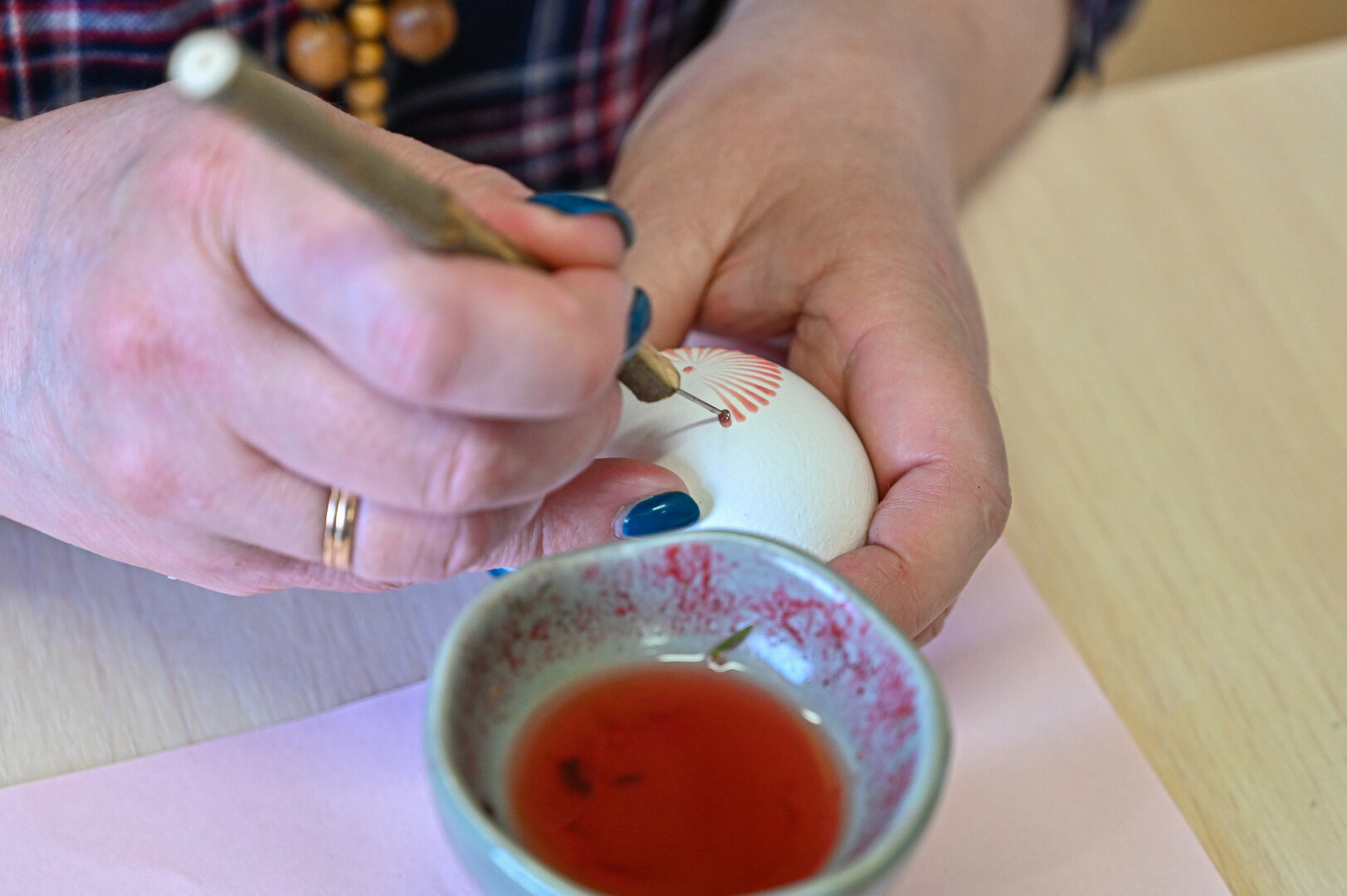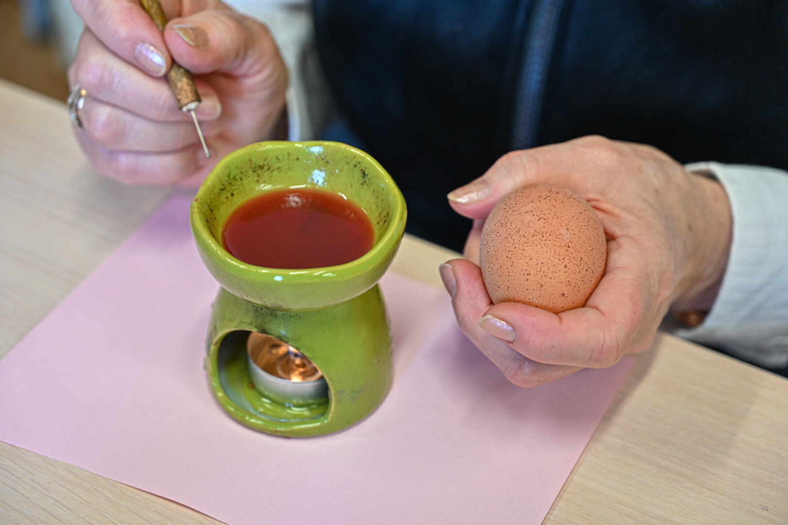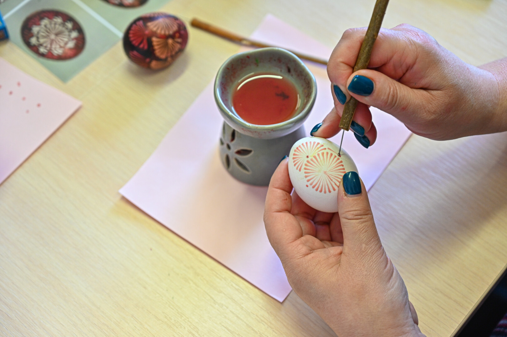 „Piešia tik skystas vaškas. Ant adatėlės jo turime nematyti. Jei pasimatys, vadinasi, jis jau per kietas“, – įspėja A. Sidorovienė.