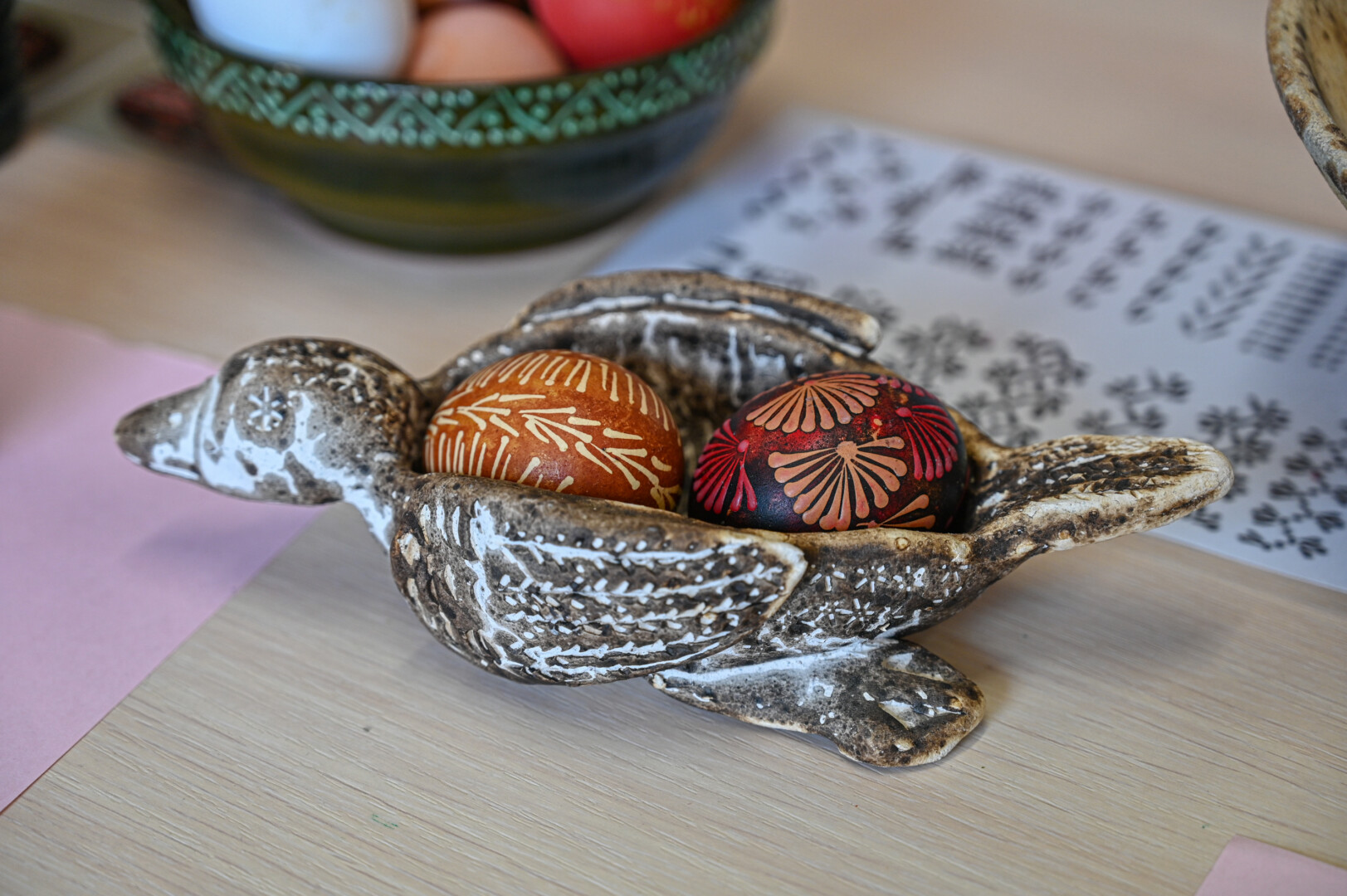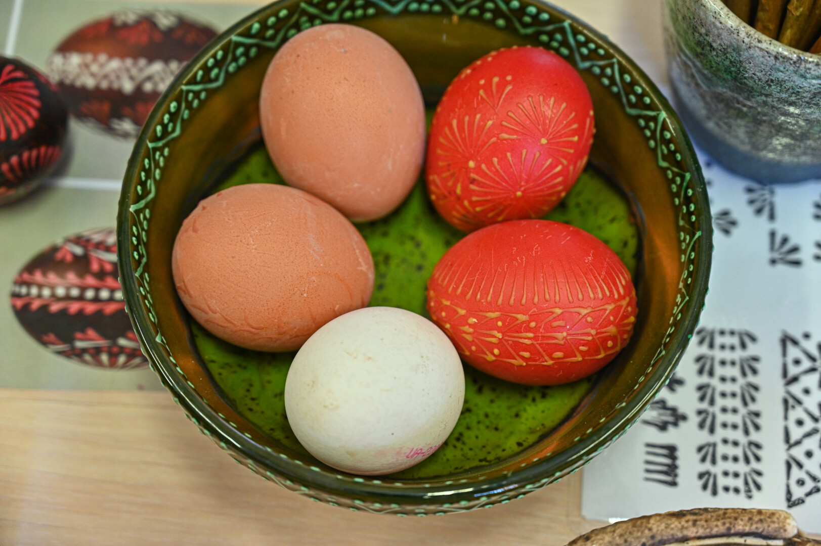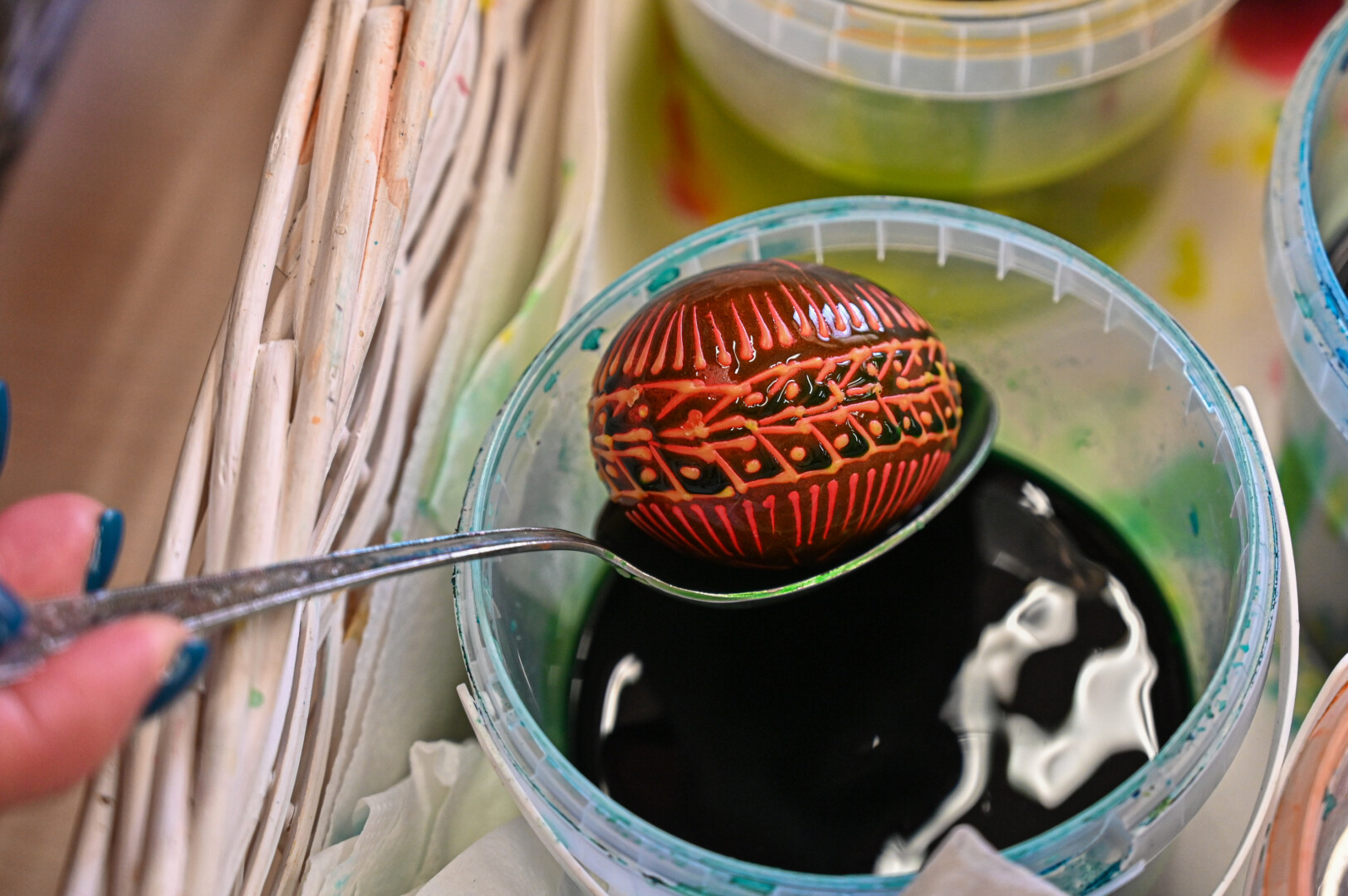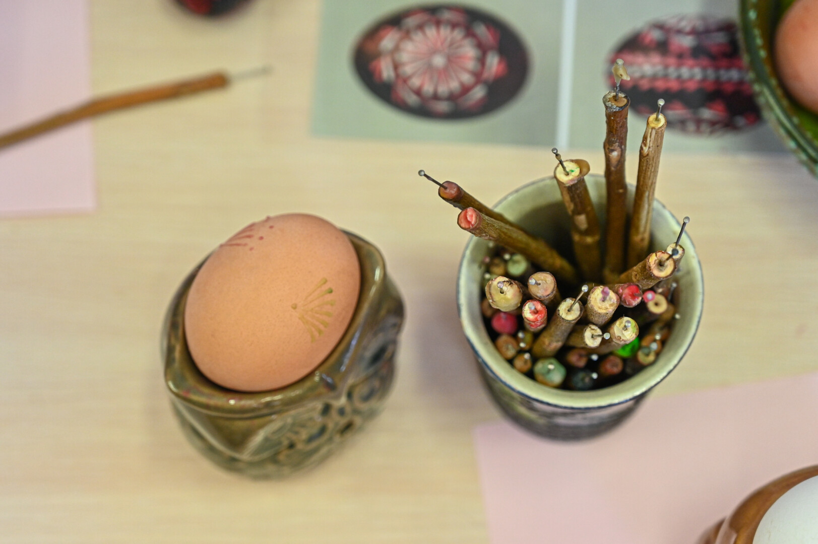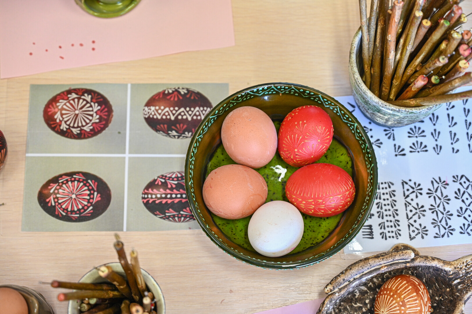 Tačiau reikia naudoti kokybišką bičių vašką. Tam, kad vaikams būtų smagiau, galima jame ištirpinti truputį spalvotos vaškinės kreidelės – taip piešiant, ryškiau matysis raštas. Pasak A. Sidorovienės, virtą kiaušinį išpiešus tokiu kelių spalvų vašku, jo galima ir nedažyti. Tiesa, ridinėti bus sudėtinga.