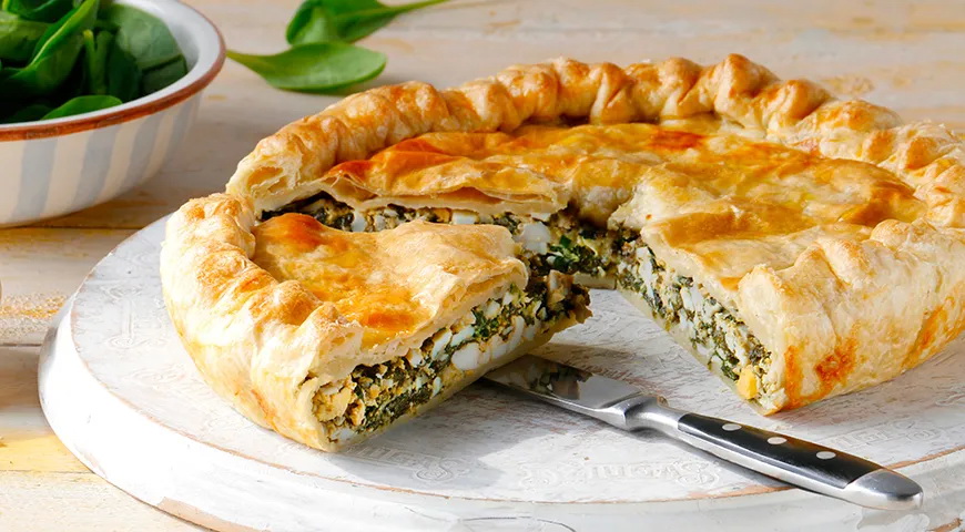 Reikės (6 porcijoms): 500 g sluoksniuotos tešlos, 400 g špinatų, 4 virtų kiaušinių, 50 g sviesto, 1 kiaušinio trynio (aptepti), druskos, šviežiai maltų juodųjų pipirų.