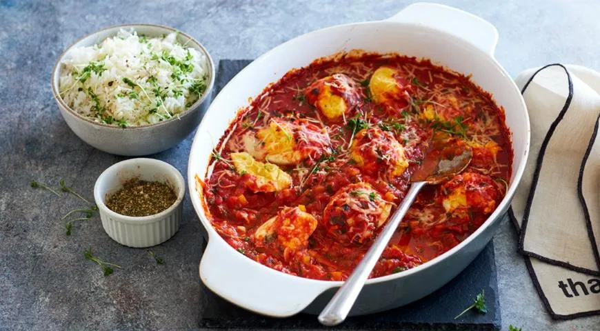 Reikės (4 porcijoms): 8–12 virtų kiaušinių, 400–500 g kapotų pomidorų savose sultyse, 150 g tarkuoto parmezano sūrio, 1 paprikos, 1 svogūno, 80 ml riebios grietinėlės, 2 šaukštų sviesto, 4 česnako skiltelių, 1 nedidelio ryšelio petražolių, 1 šaukštelio Dižono garstyčių, druskos, šviežiai maltų juodųjų pipirų.