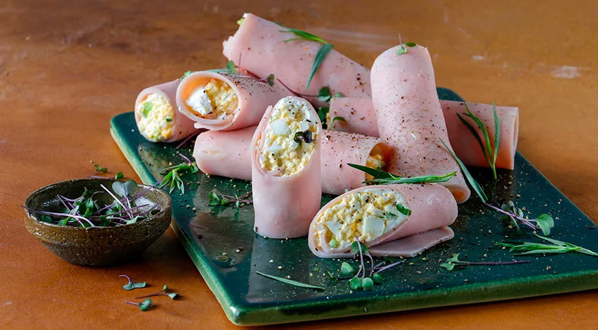 Reikės (4 porcijoms): 8 griežinėlių virto kiaulienos kumpio (maždaug 320 g), 5 virtų kiaušinių, 150 g kreminio sūrelio (gali būti ir su priedais), 40 g svogūnų laiškų, 2 šaukštų majonezo, druskos, šviežiai maltų juodųjų pipirų.