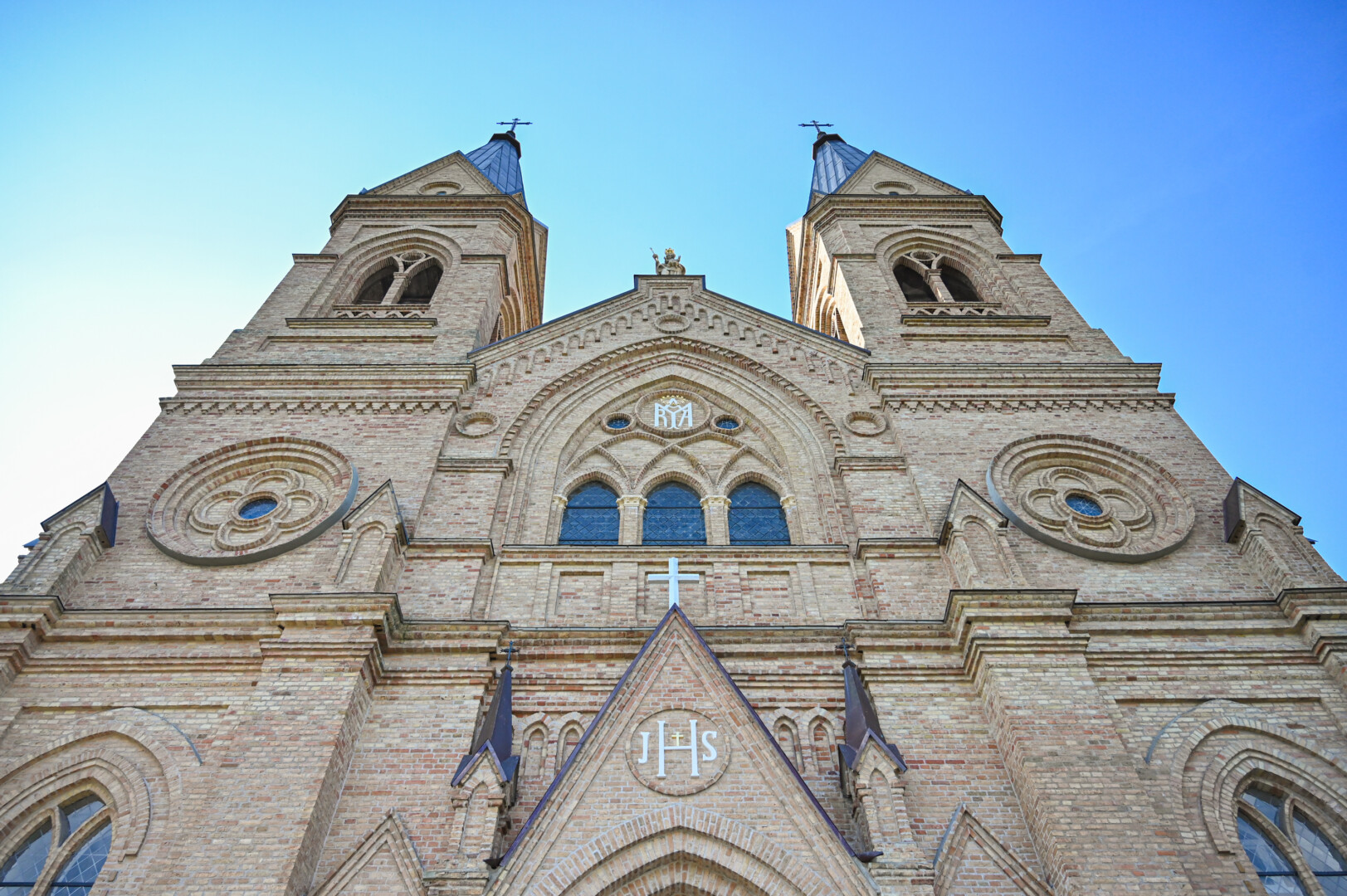 Tačiau svarbiausias išorės akcentas – tarp bažnyčios bokštų įsitaisiusi Švč. Mergelės Marijos Karalienės su Kūdikėliu Jėzumi smiltainio akmens skulptūra.