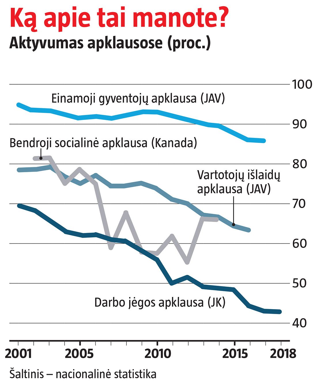 Aktyvumas apklausose mažėja visame turtingajame pasaulyje. Pernai darbo jėgos tyrime dalyvavo tik apie 43 proc. namų ūkių iš tų, į kuriuos kreipėsi britų vyriausybė, palyginti su 70 proc. 2001 m. (žr. grafiką). Namų ūkių, sutinkančių atsakyti į JAV einamosios gyventojų apklausos klausimus, dalis per tą patį laiką sumažėjo nuo 94 iki 85 proc. Kitose Europos šalyse ir Kanadoje tendencijos panašios.