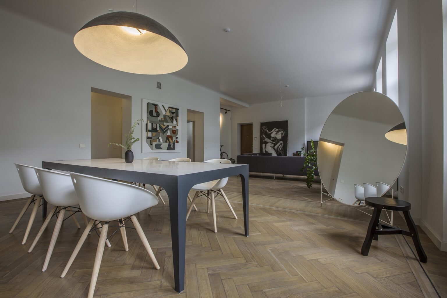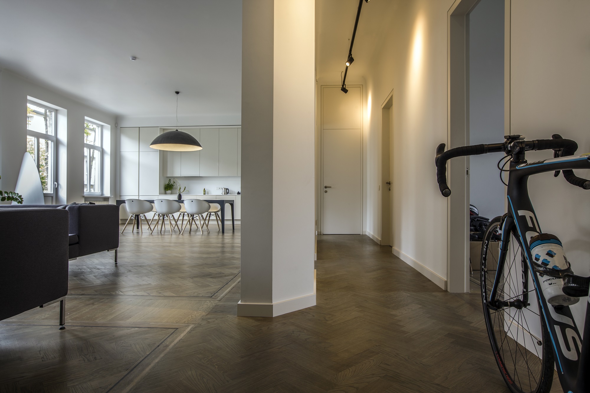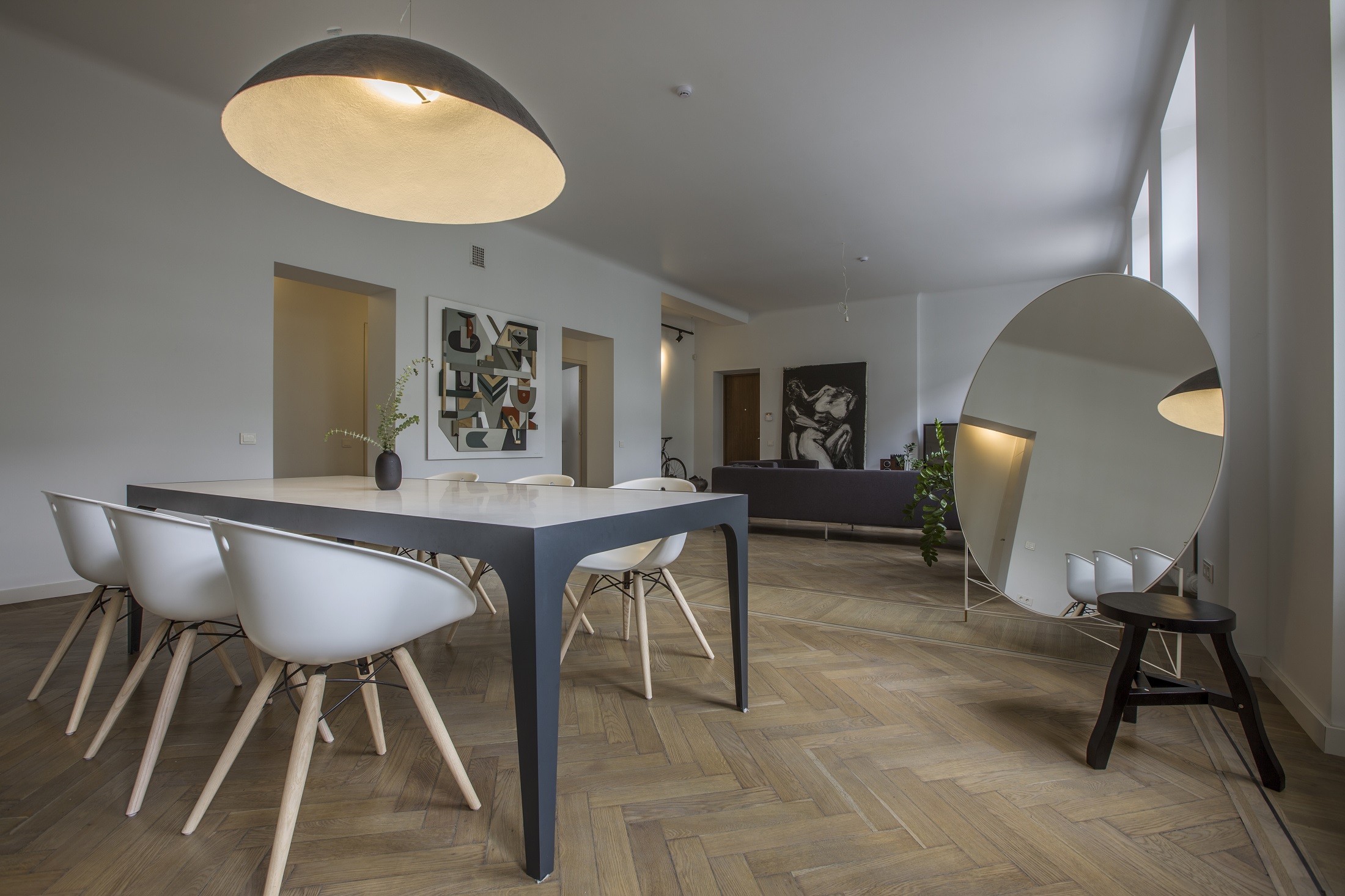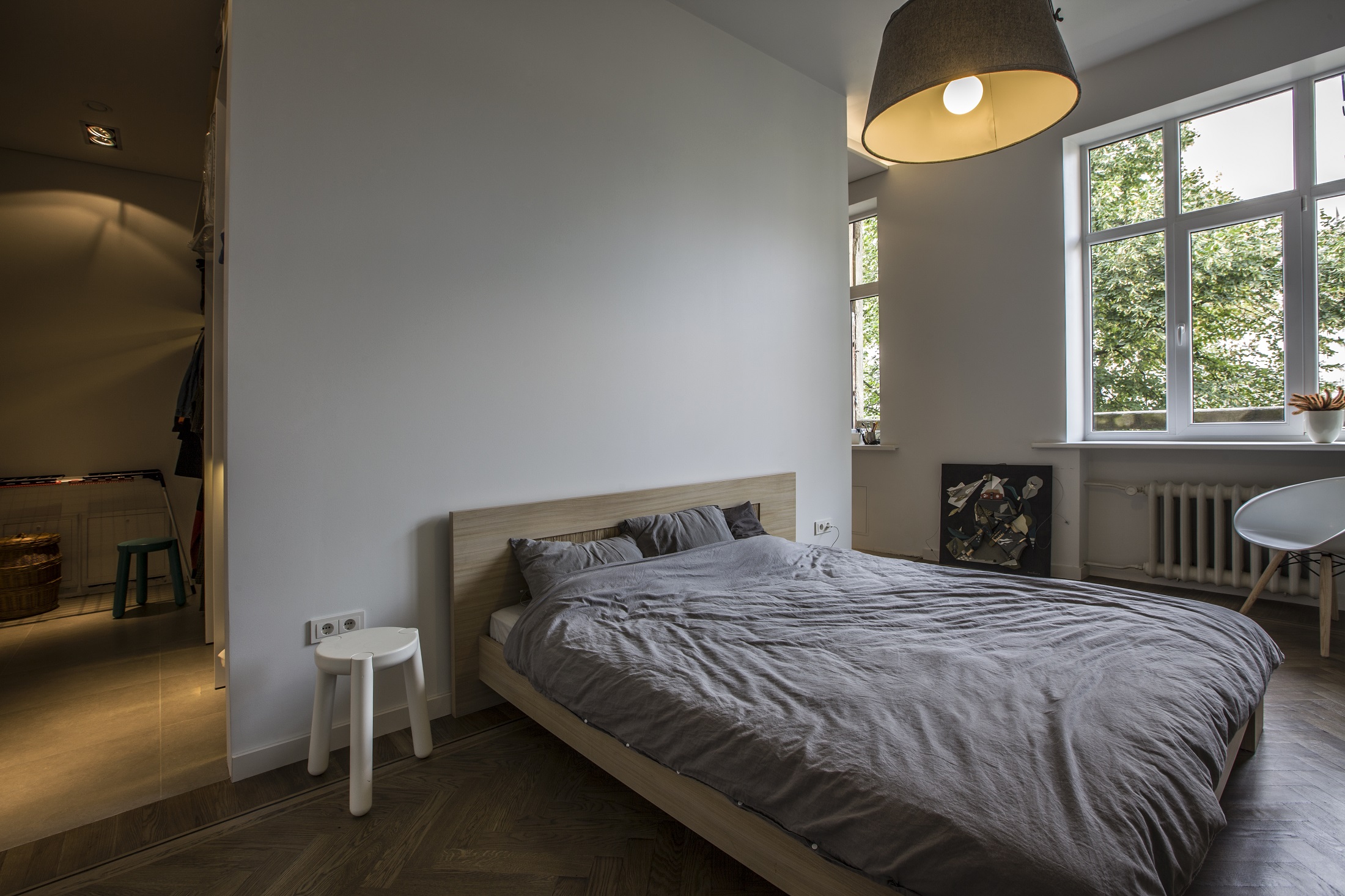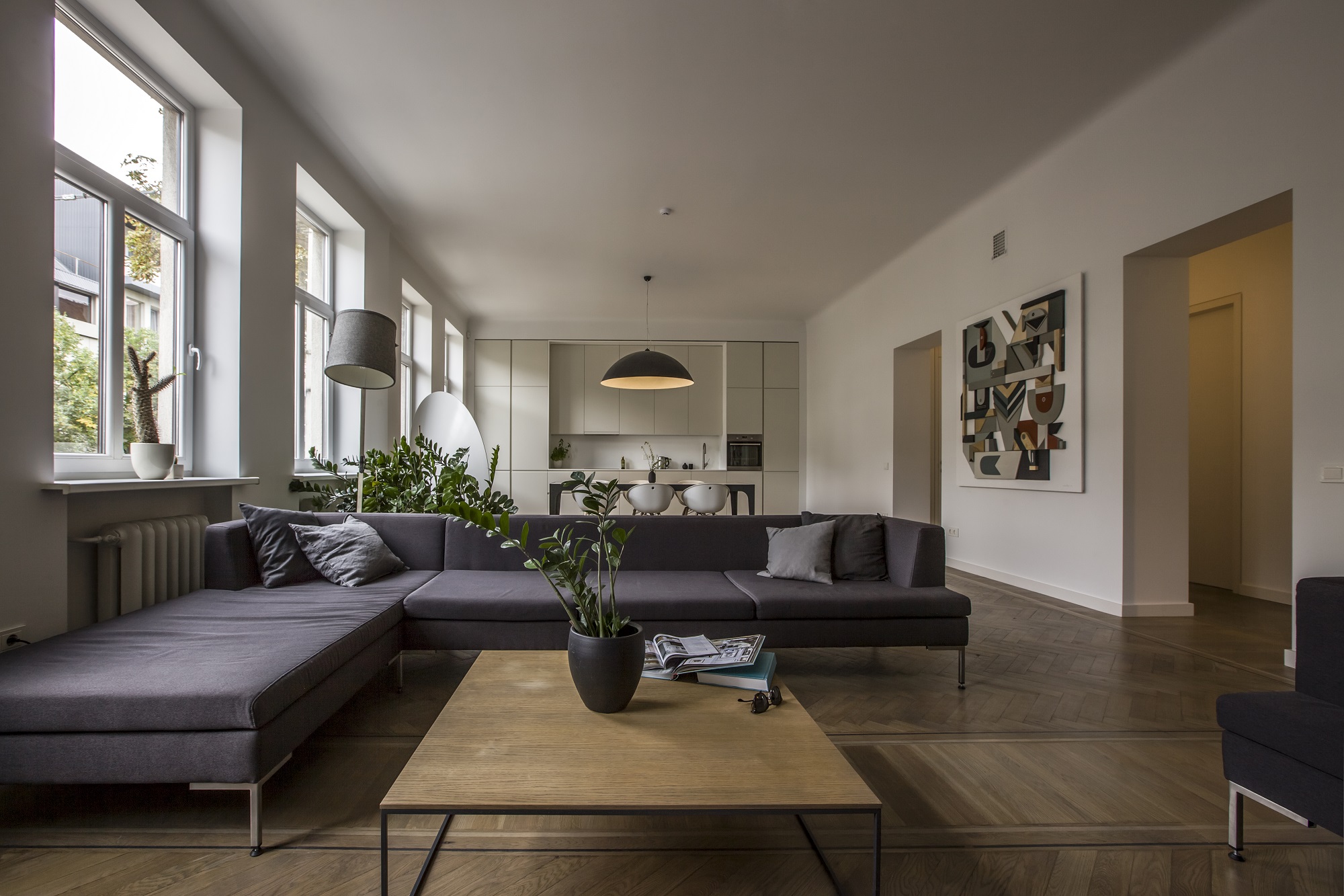 Kai prieš maždaug trejus metus kaunietis įsigijo šį būstą, nei šviesumu, nei didelėmis erdvėmis jis pasigirti negalėjo. Tai buvo net penkių kambarių butas, gerokai apleistas ir nugyventas. Tačiau aukštos lubos, galimybė keisti buto išplanavimą ir patraukli lokacija nusvėrė sprendimą pirkti. „Man patiko ir grindys – senuoju kiliminiu būdu sudėtas parketas. Kur pavyko, išsaugojau jį autentišką“, – pasakoja savininkas. Maždaug trečdalį parketo teko pakeisti nauju, specialiai pagamintu pagal senojo pavyzdį.