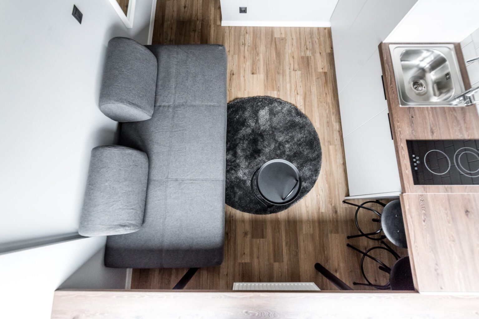 D. Sakevičė sako, kad tokioms mažoms erdvėms sudėtinga pritaikyti standartinius baldus. Šiuo atveju teko ilgokai paieškoti patogios ir gražios sofos, nes išskleidžiama dvigulė čia tiesiog netilpo. Sofa atlieka ne tik pagrindinę, bet ir daiktadėžės funkciją.